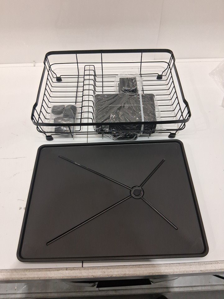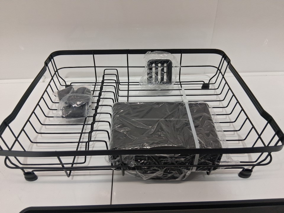 unbranded dish drying rack with utensil holder, drainboard and spout - 6" x 17" x 12" - black