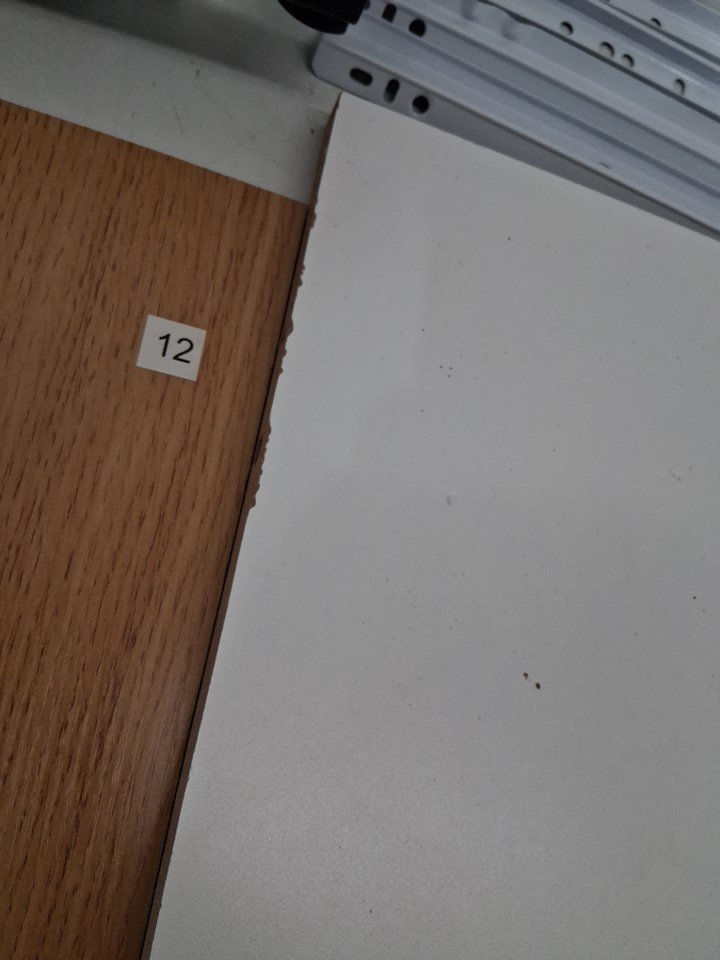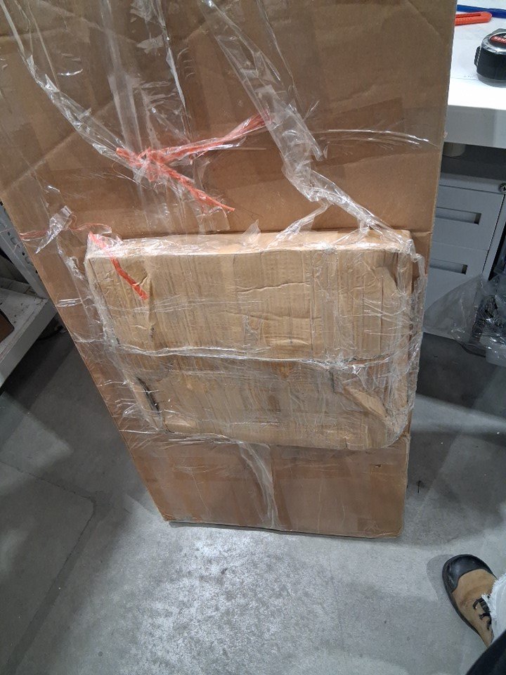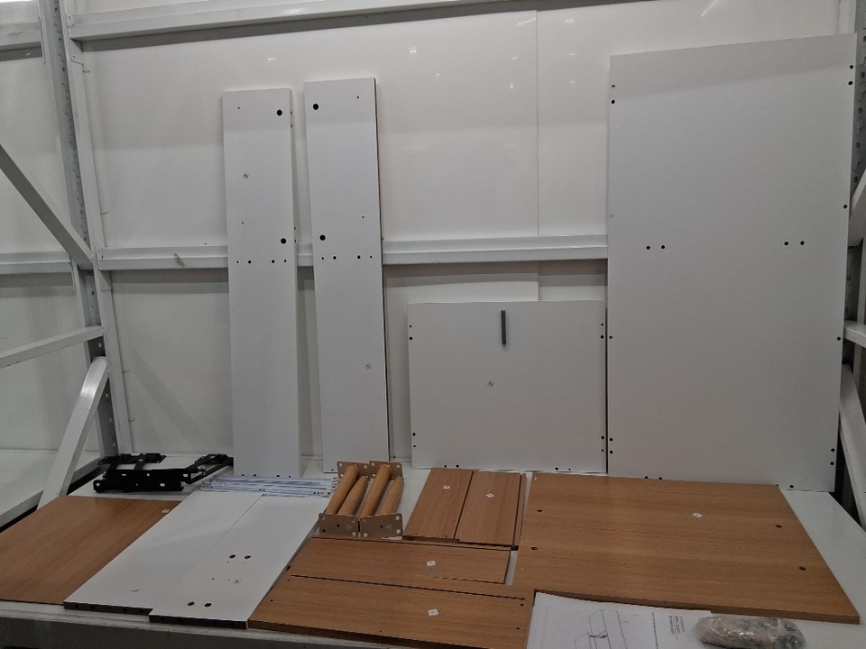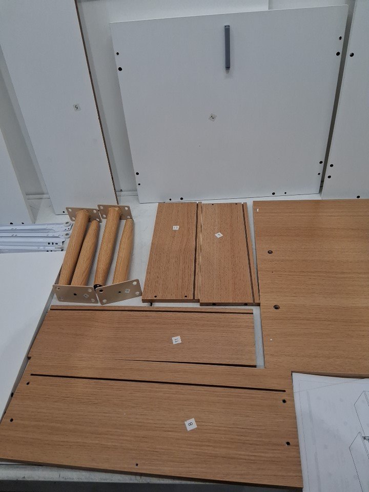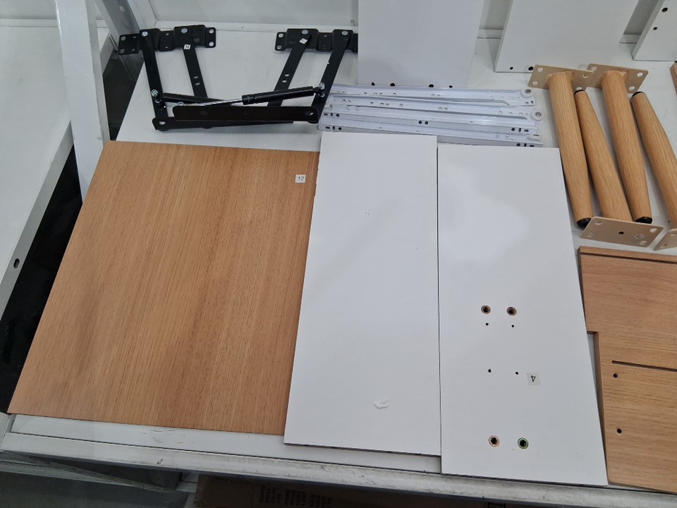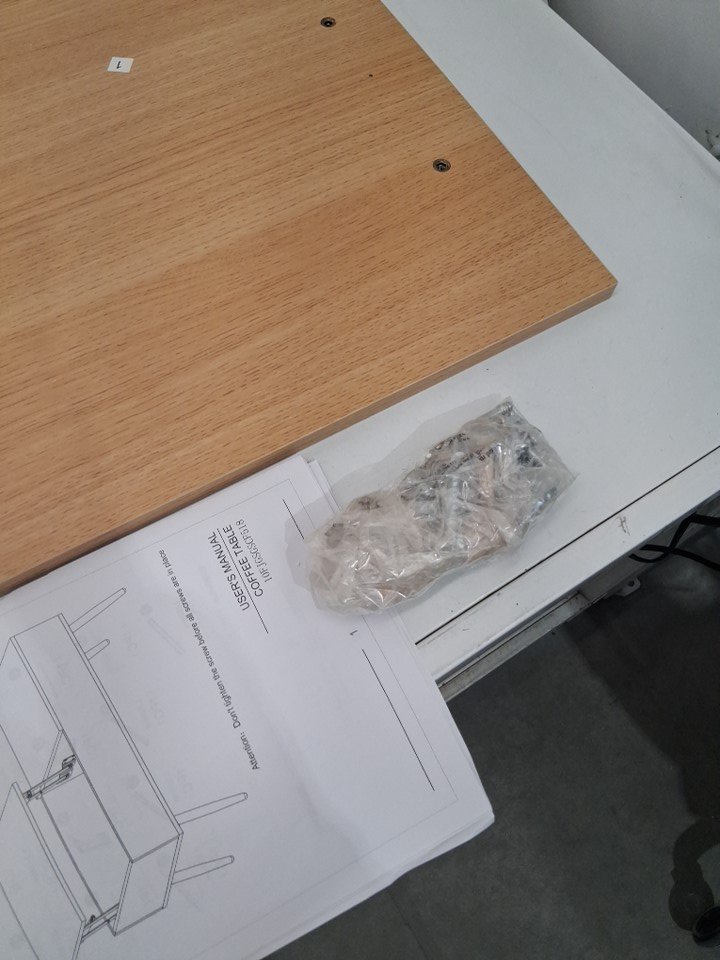 table has blemishes and distressed edges from previous assembly. Hardware is wrapped up