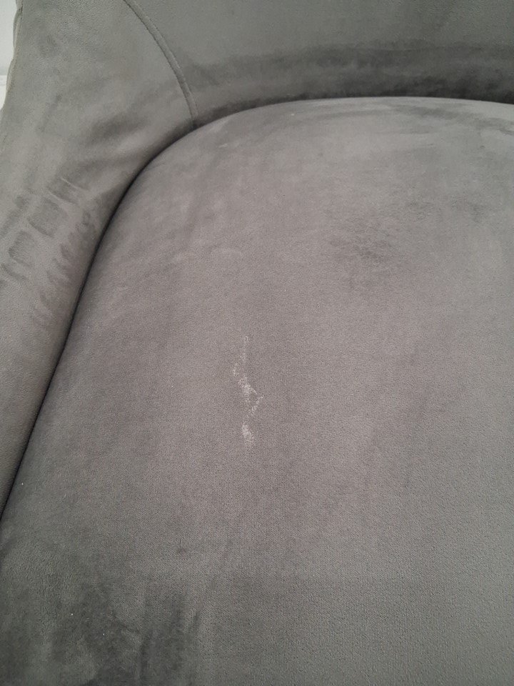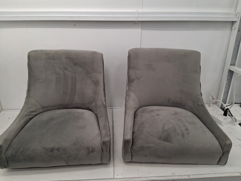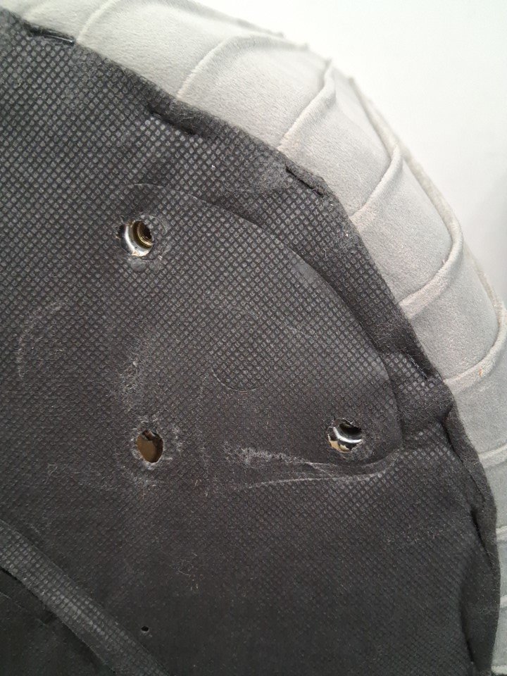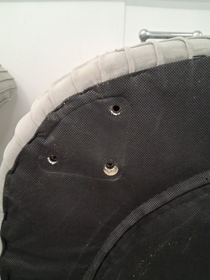 The leg holes on the underside of the seat have indentations around them and some scratches on the fabric, indicating previous assembly. There is also a small stain on one of the seats, though it should wash out fairly easily - see photos. Other these cosmetic issues, the chairs appear to be in close to new condition with no visible damage to any parts.