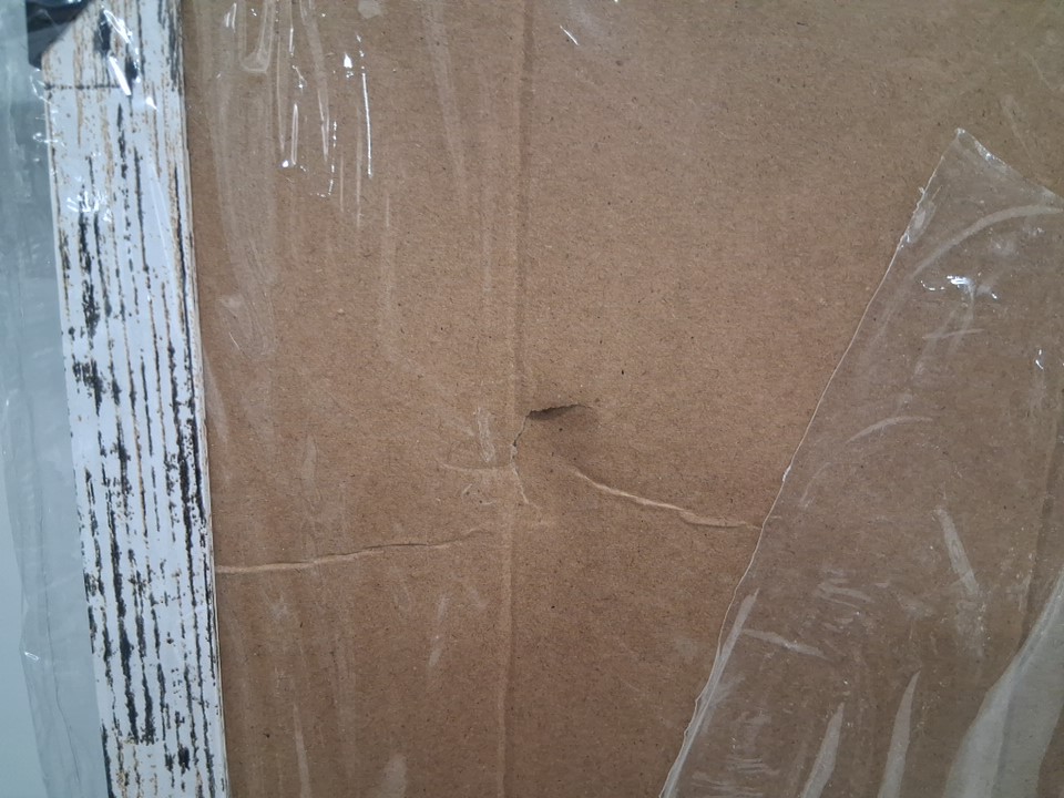 Minor indent on backing of board caused during shipping. Front not affected. (See photos)