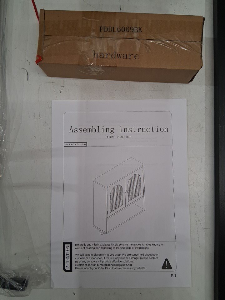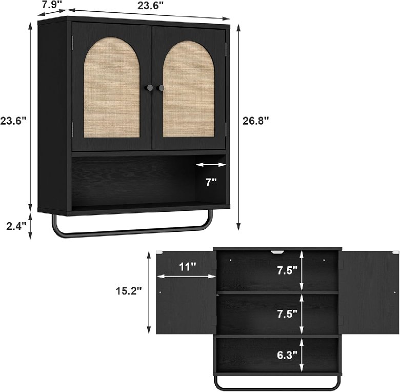 RUSTOWN Rattan Boho Arched Double Door Wall Cabinet with Adjustable Shelves & Bar - 24.4" L x 8" D x 26" H - Black (Model: ‎PDBL6069BK)