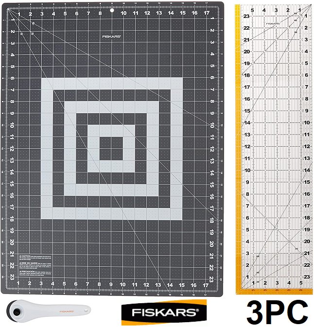 3PC Fiskars Rotary Cutting Set - 18" x 24" Cutting Mat, 6"x 24" Acrylic Ruler, Stick Rotary Cutter (M# 95237097J)