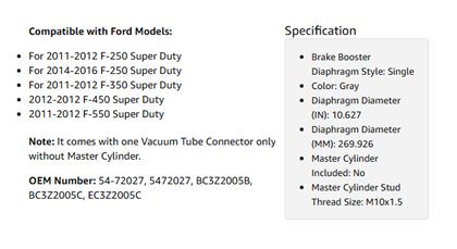A-Premium Vacuum Power Brake Booster - Compatible with Select Ford Models - BLACK (MODEL: 72027)
