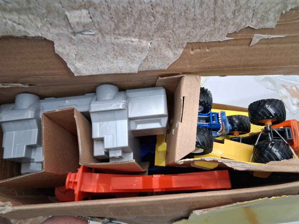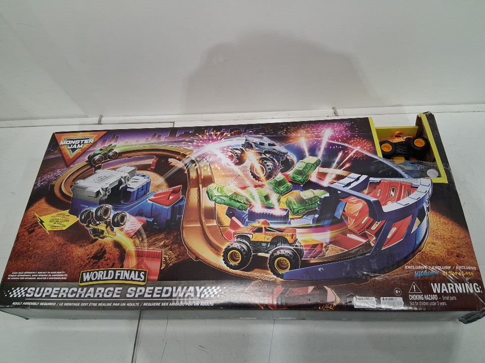kids Monster Jam Supercharge Speedway Light Up World Finals Track Playset with Megalodon and El Toro Loco Die-Cast Monster Trucks
