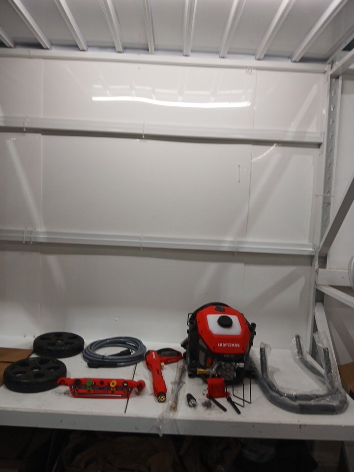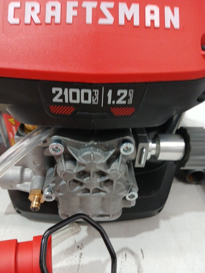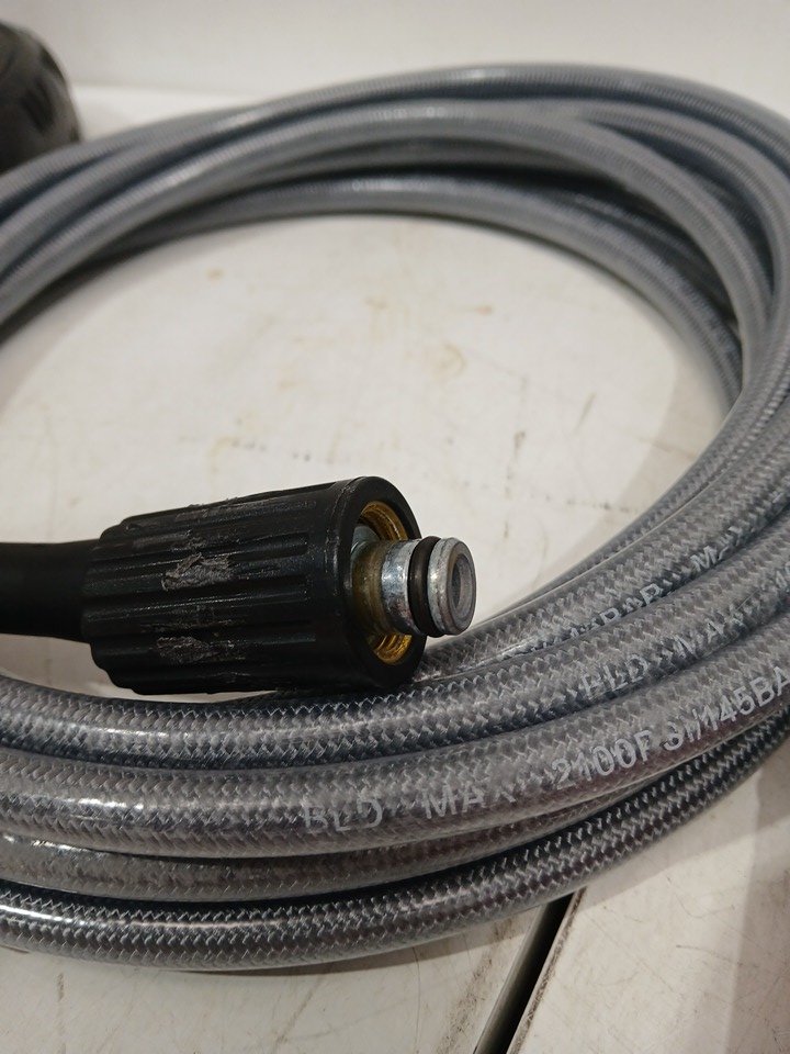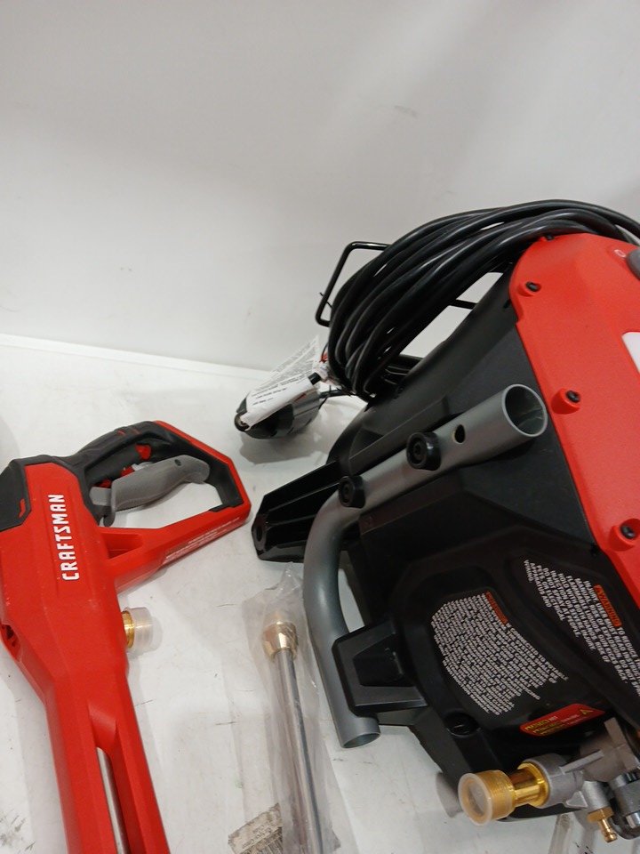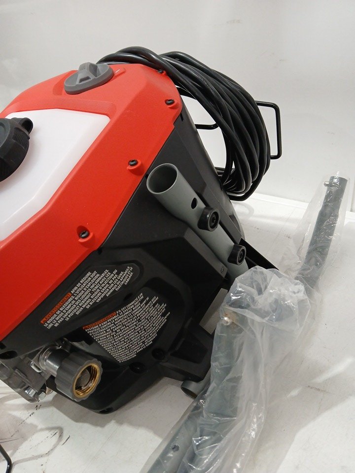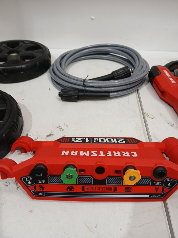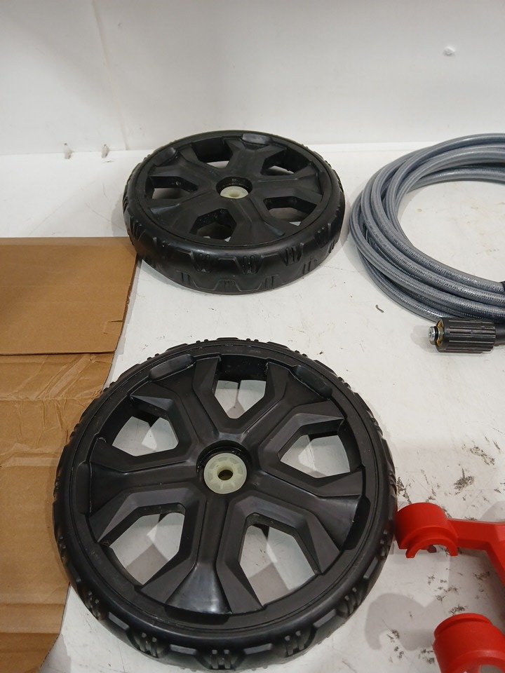 Missing some nozzles, has some rusting on the handle end, the wheels show use. Tested for power.