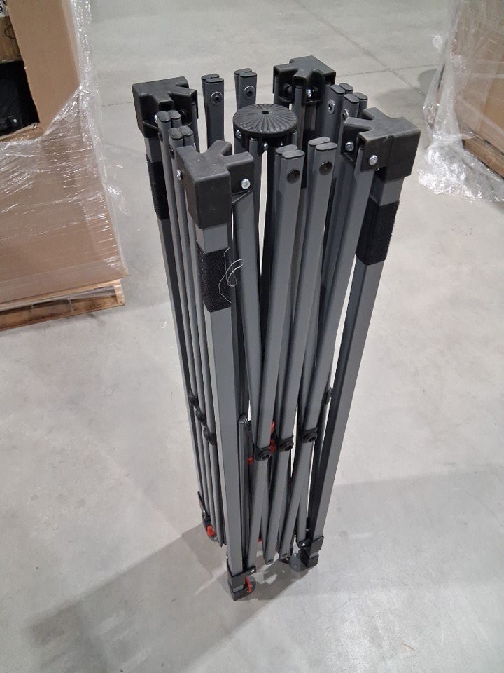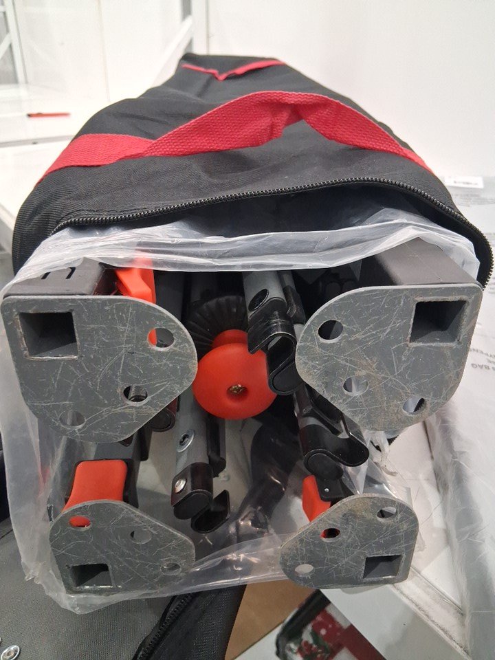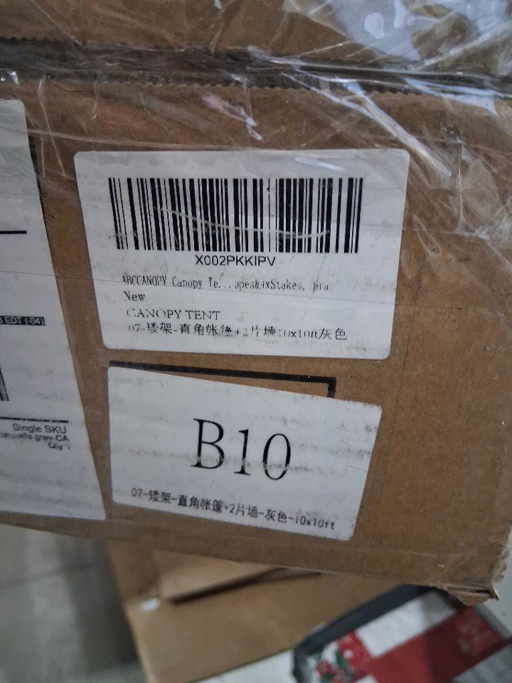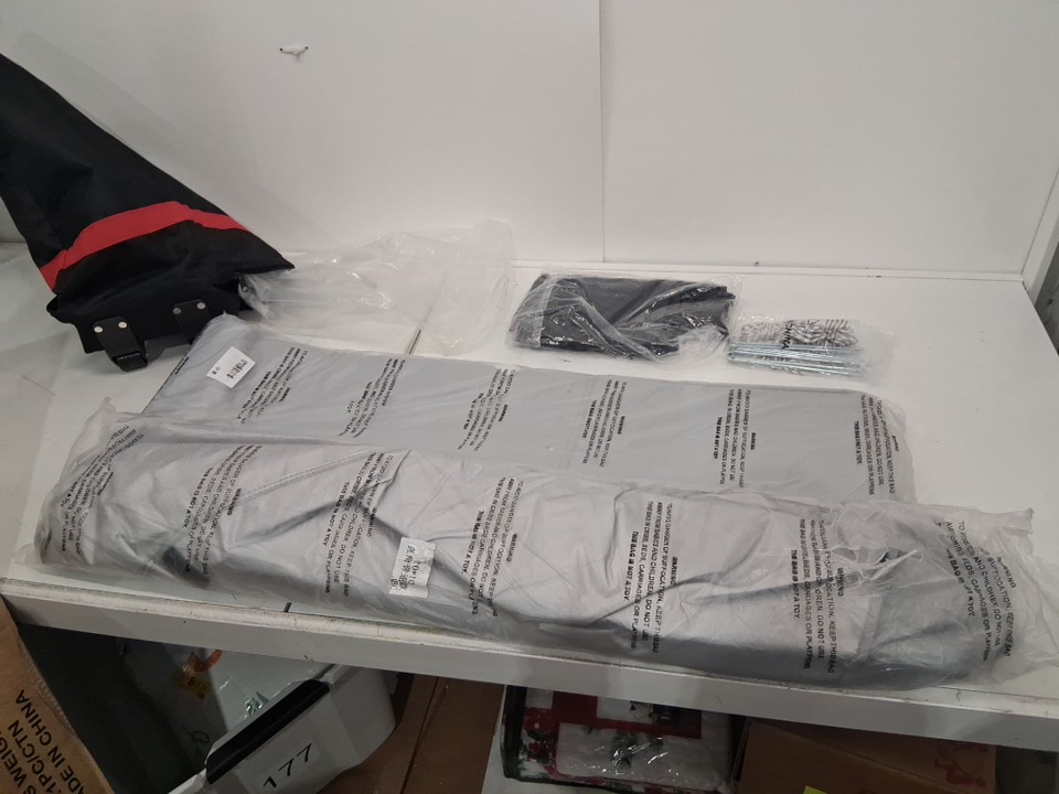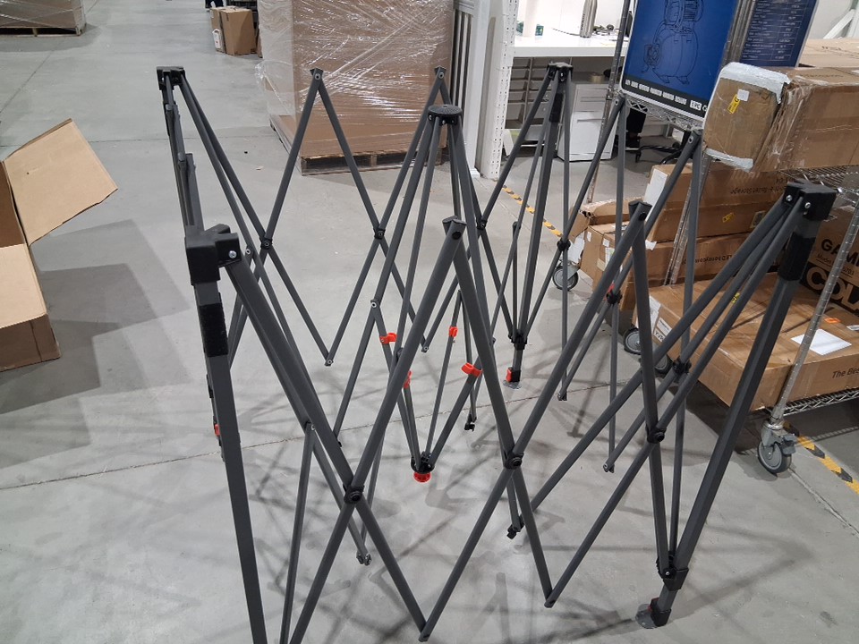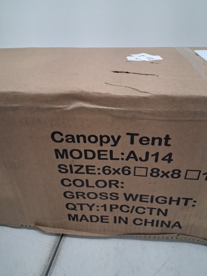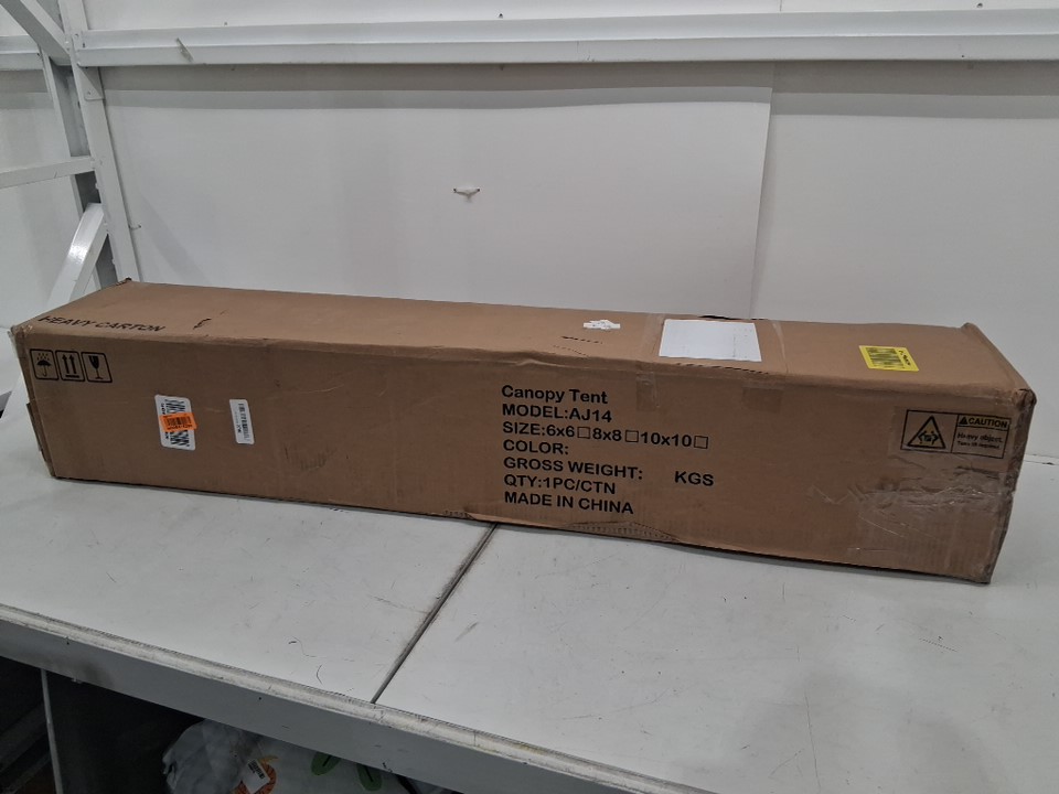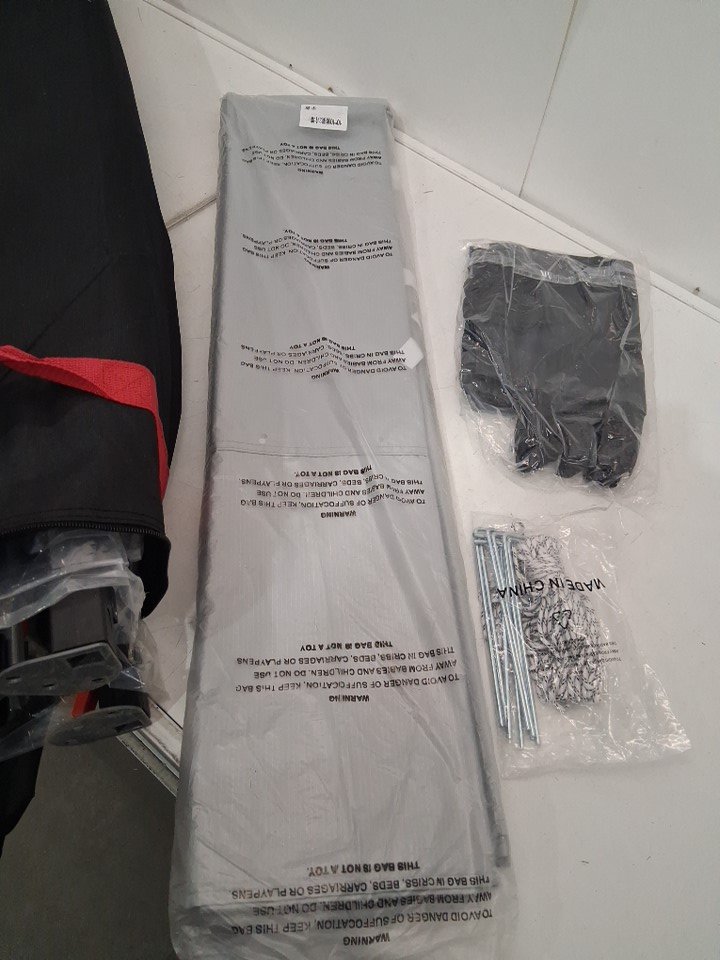 Bottom of frame has scratches and dirt discoloration however pegs, rope and one package of sides/top is sealed