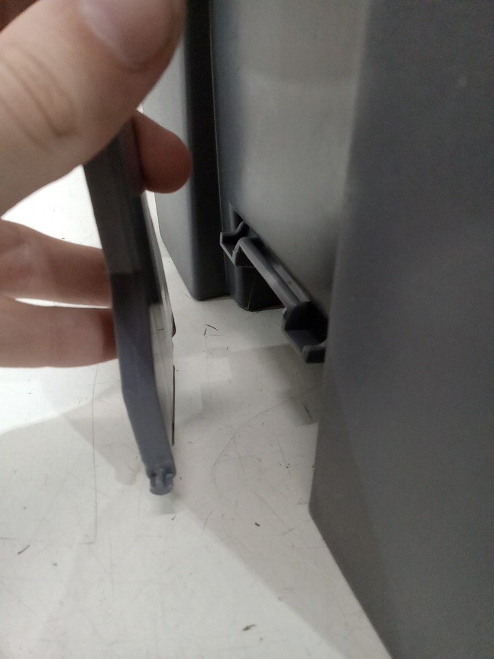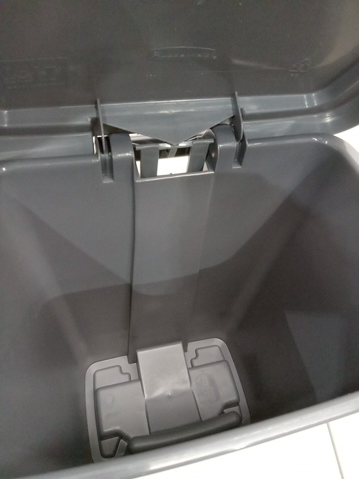 The back lever that opens the lid is loose, but can likely be fixed with glue or tape. When properly connected still opens the lid as intended.