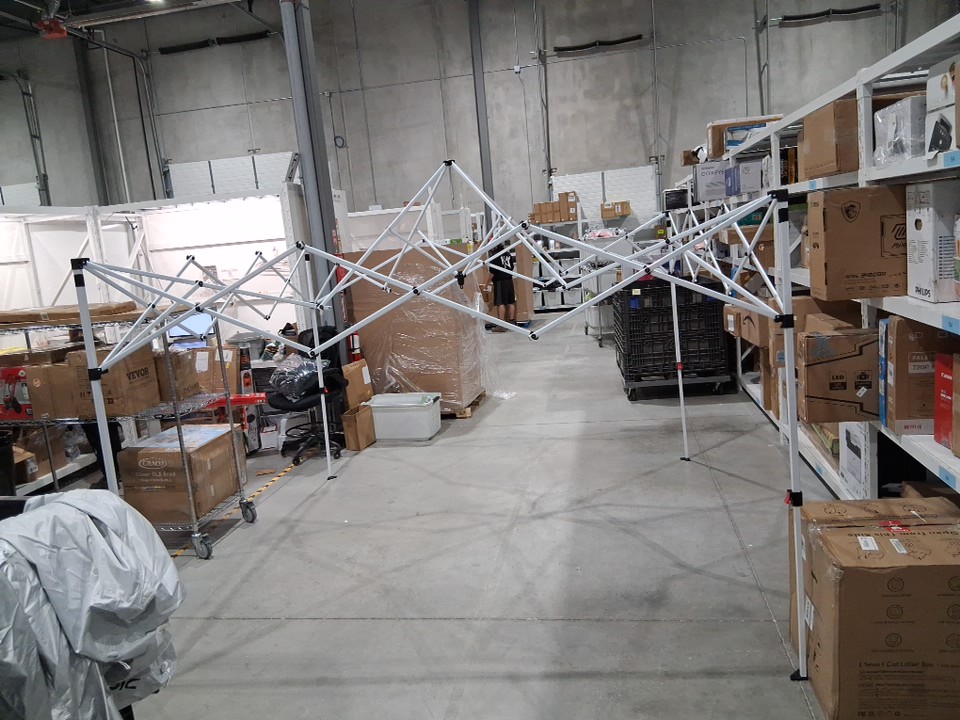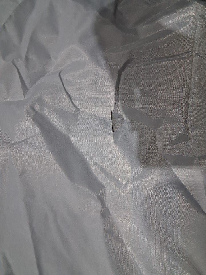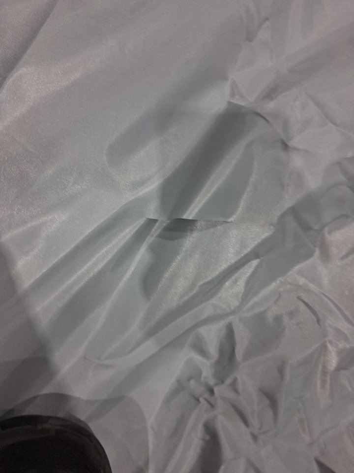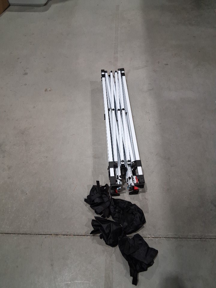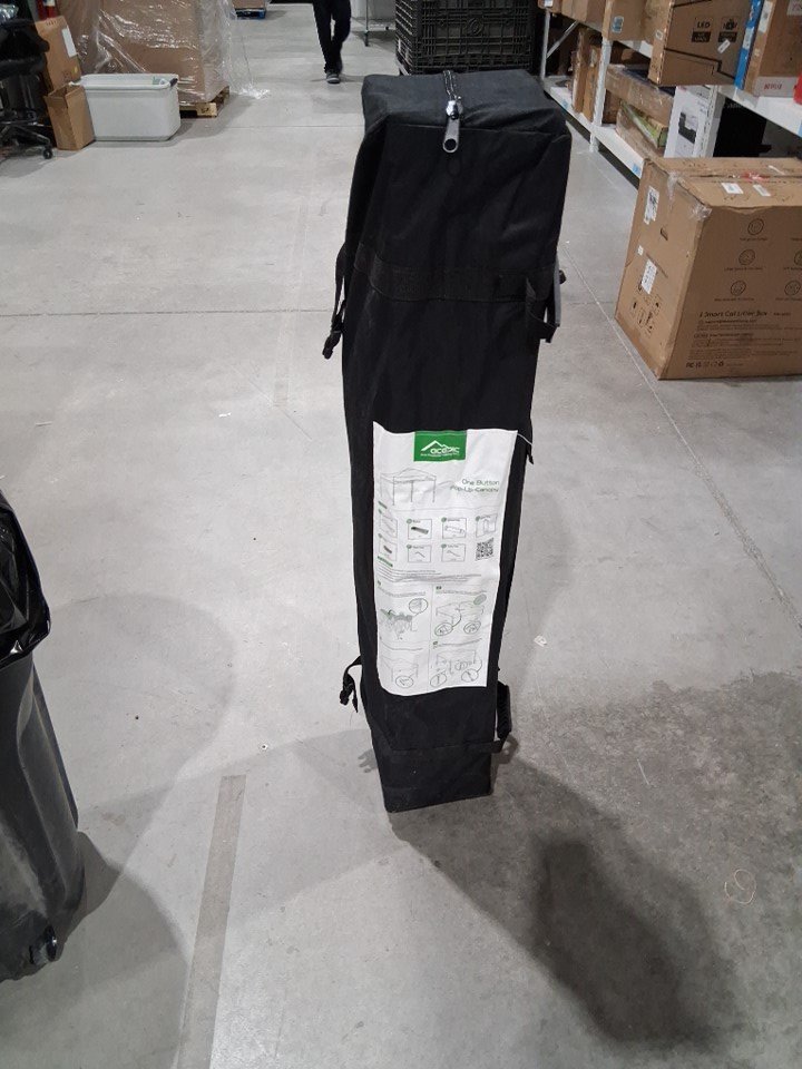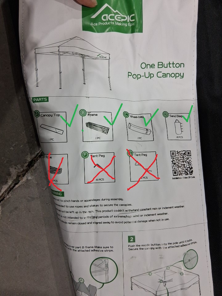 one of the poles has a slight bend in it this did not effect setting up the item, there is a small rip in the carry bag and some rips in the canopy as well item is missing the 4 ropes and 8 tent pegs