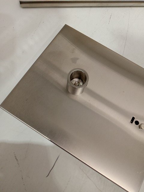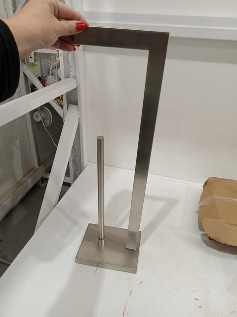 has some minor scratches and a small in dent on the base of the holder. hardware is missing to connect the long pole.