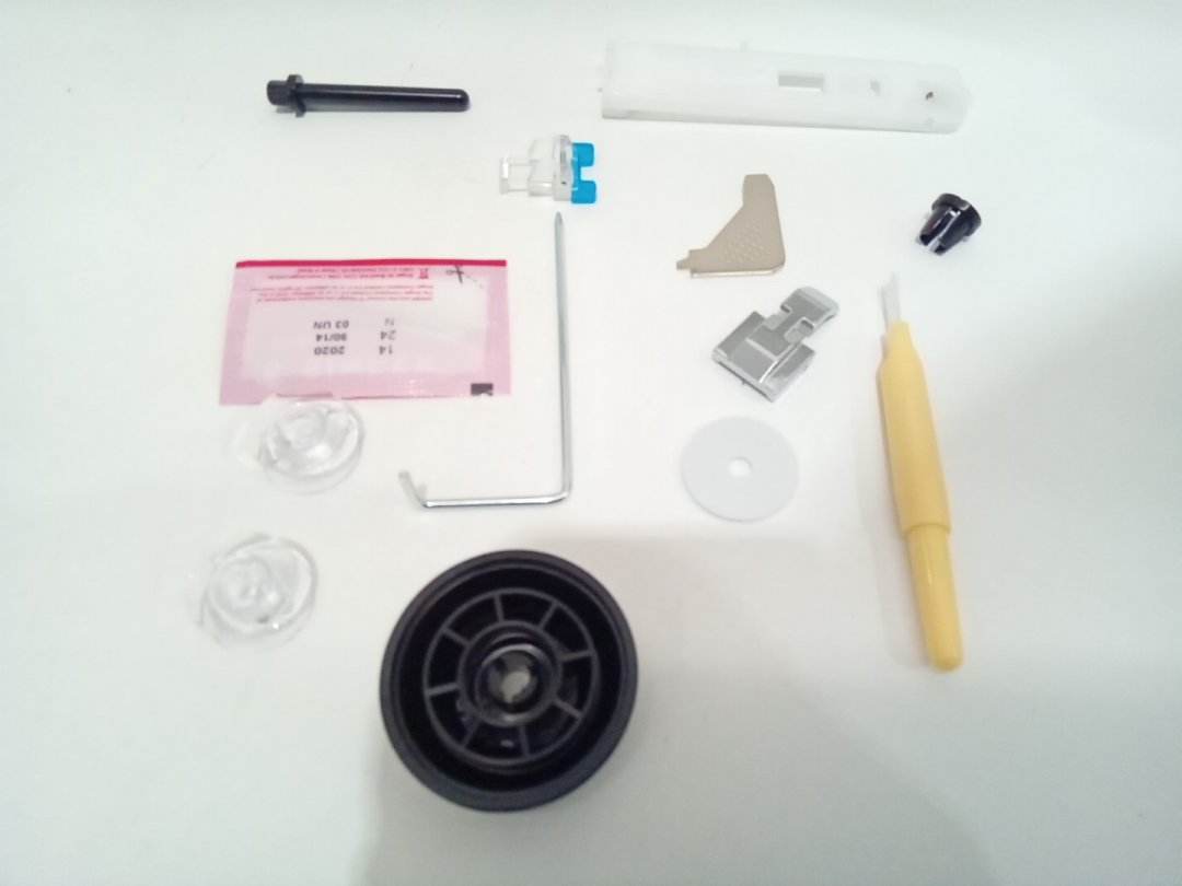 Signs of light wear on the needle plate suggests prior use. Because of this, set is missing one of the extra bobbins and may be missing other replaceable accessories. Please see photos.