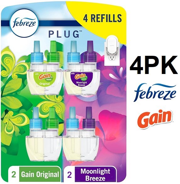 4pk febreeze plug-in air freshener refill - 2 gain original & 2 gain moonlight breeze (model: 80750237)