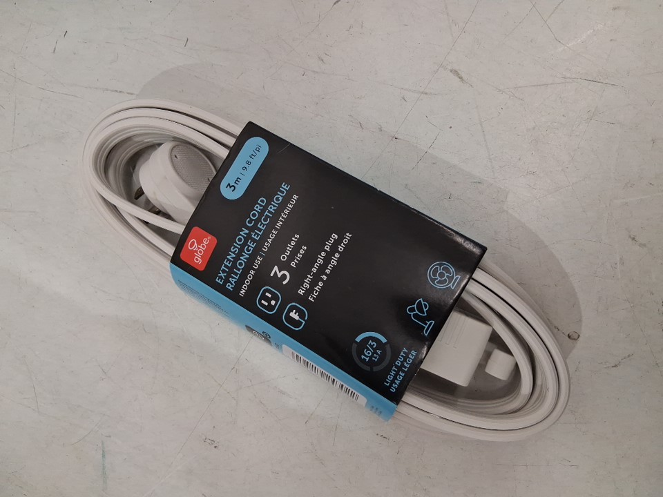 GLOBE ELECTRIC 3-OUTLET INDOOR EXTENSION CORD WITH RIGHT-ANGLE PLUG - GROUNDED - 9.8FT - WHITE