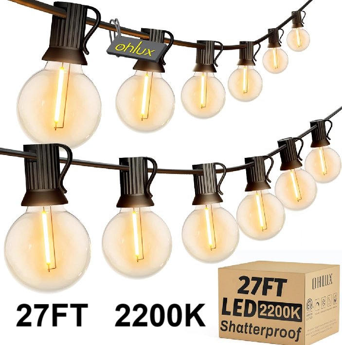 OHLUX LED Shatterproof weather resistant dimmable outdoor string lights - 120V - 50W - 2200K - 27FT (model: ‎GLS-20J2P-E17-G40-12)