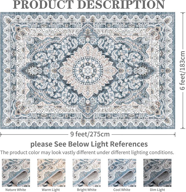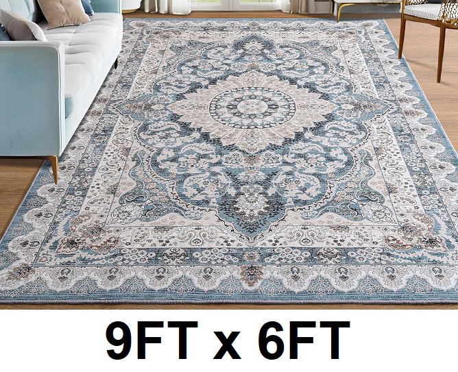 foxmas vintage machine washable area rug with rubber backing - 9ft x 6ft - blue