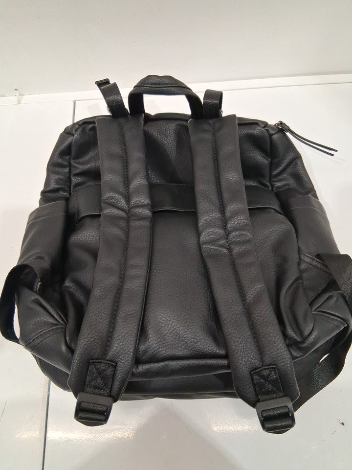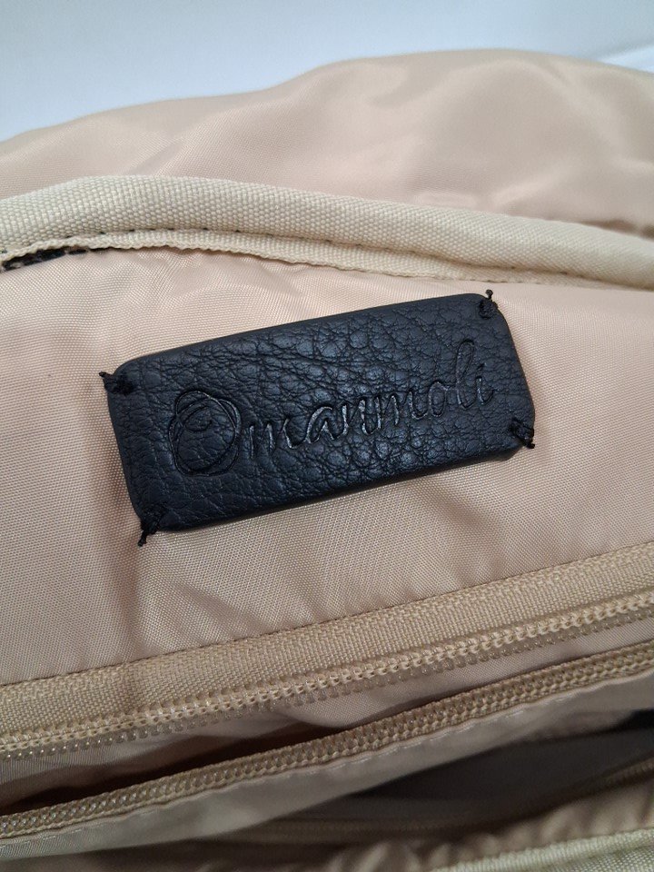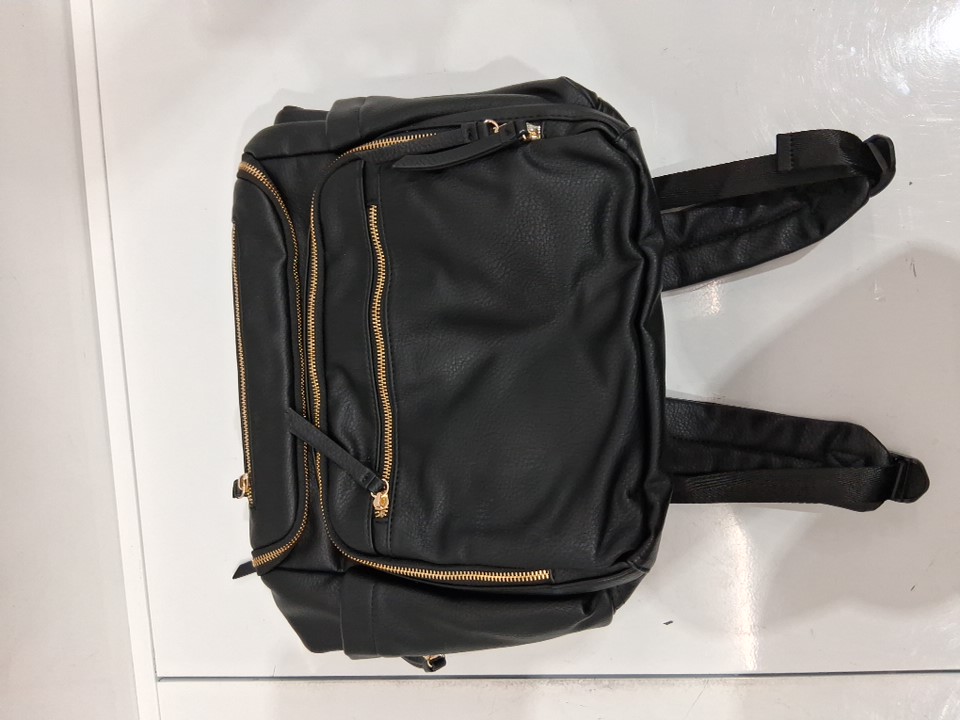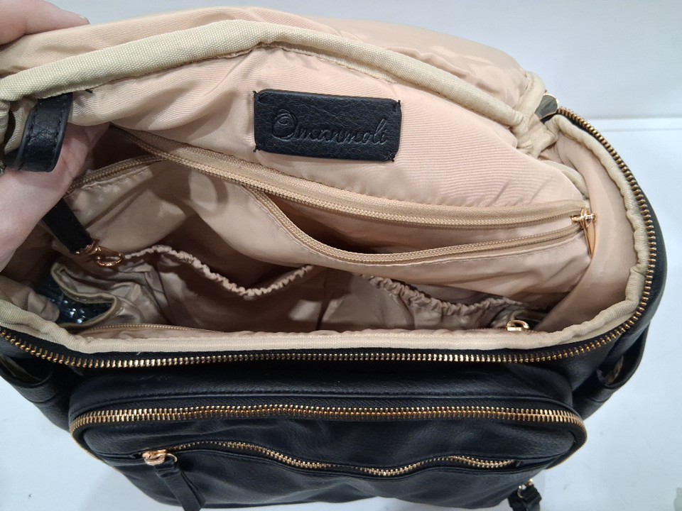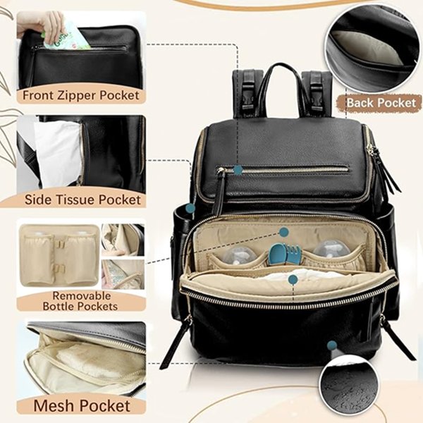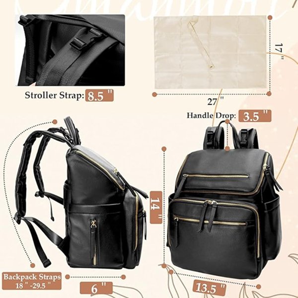 omanmoli leather diaper bag backpack with 17 pockets and changing pad - 13.5"x14" - black/GOLD (MODEL: FA220704)