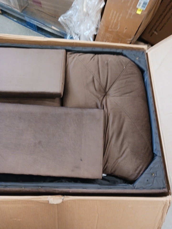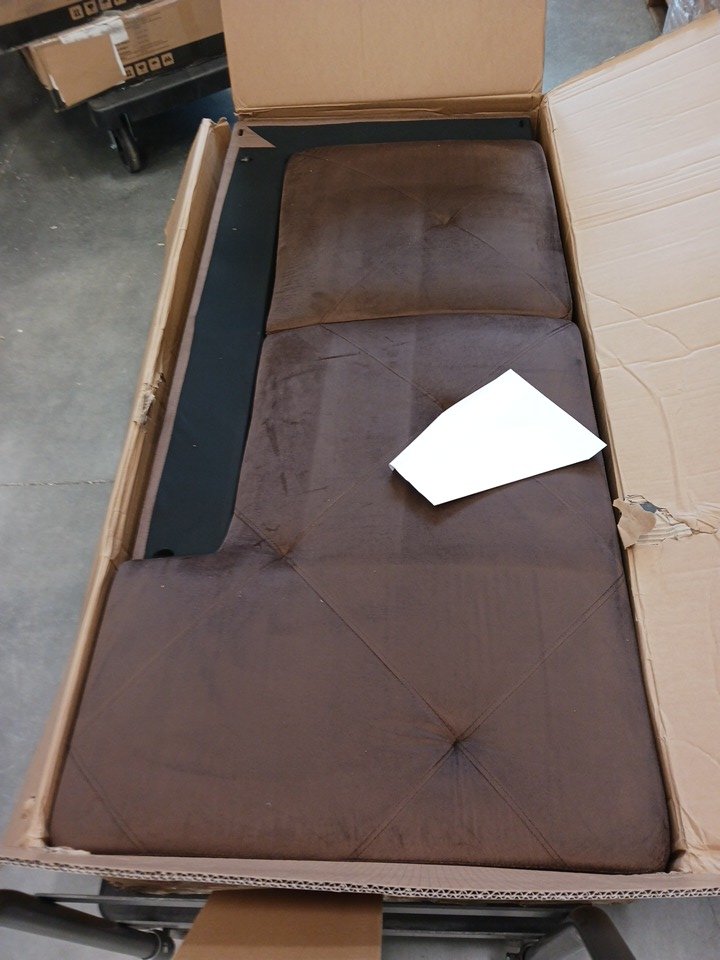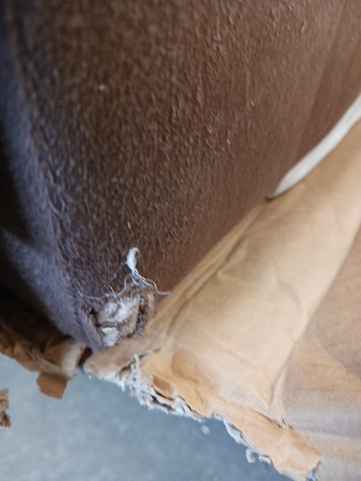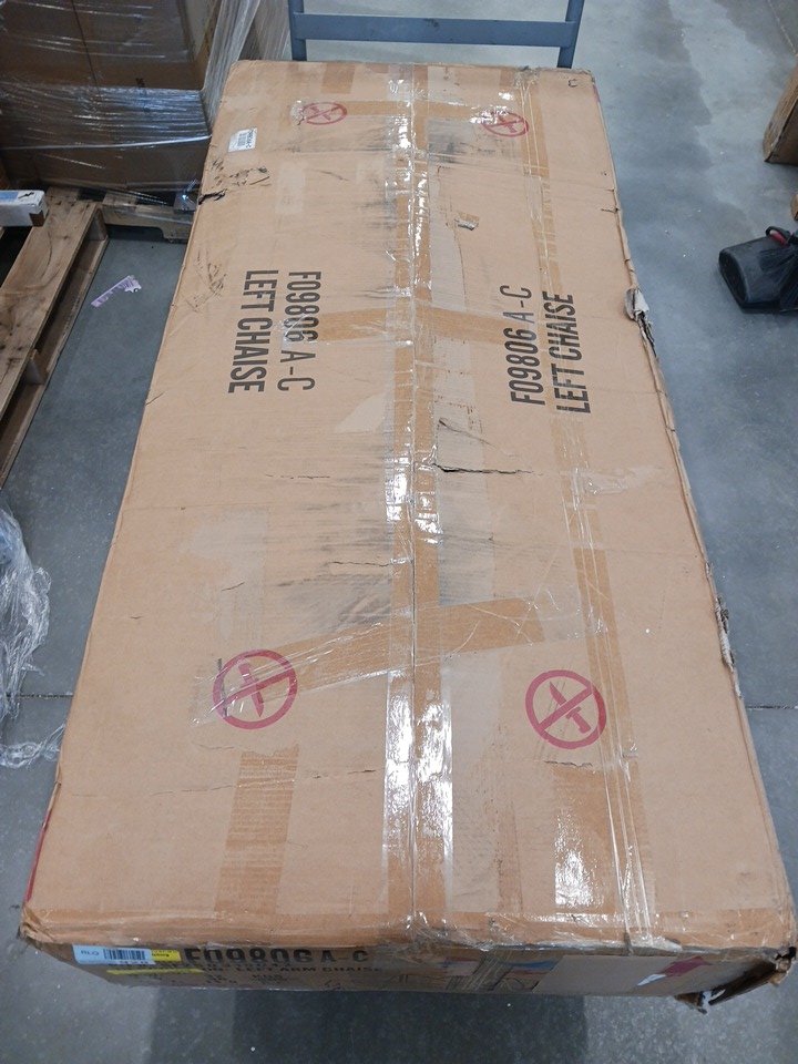 The item arrived in a distressed package, and there is a visible tear in the fabric along one edge of the sofa where the packaging was exposed. The affected area appears limited to the surface material and does not impact the structure or seating integrity of the chaise. The frame, cushions, and upholstery elsewhere remain in good condition, with no other visible damage or defects.