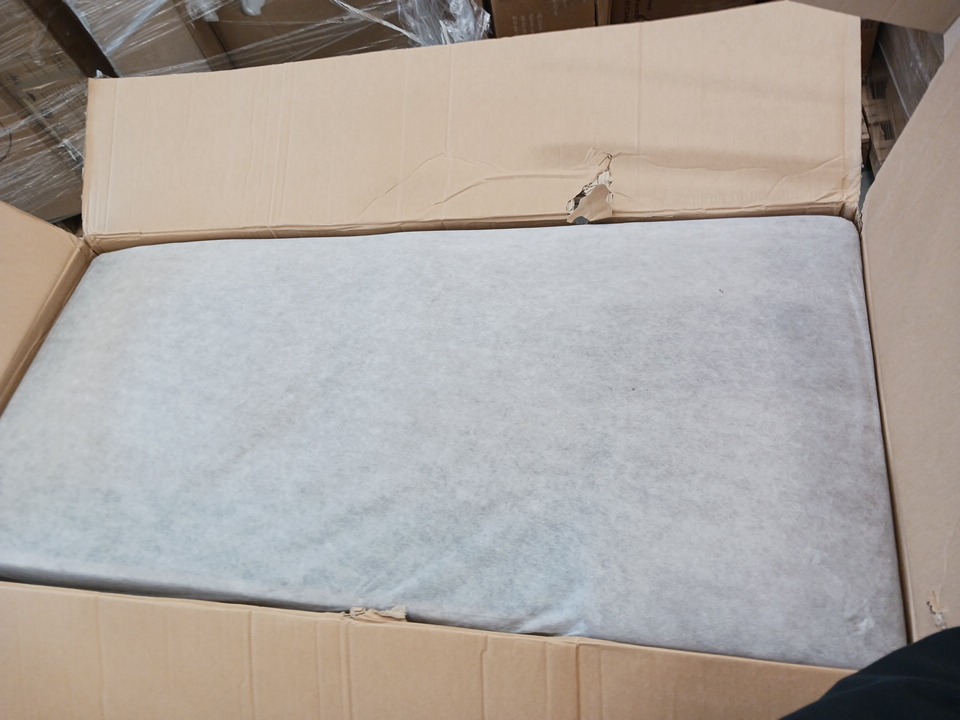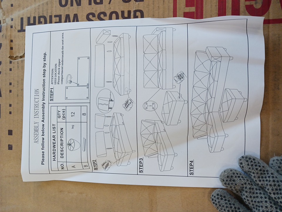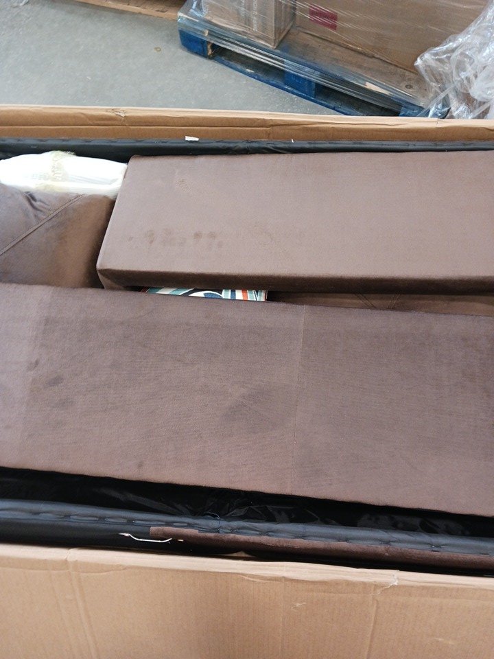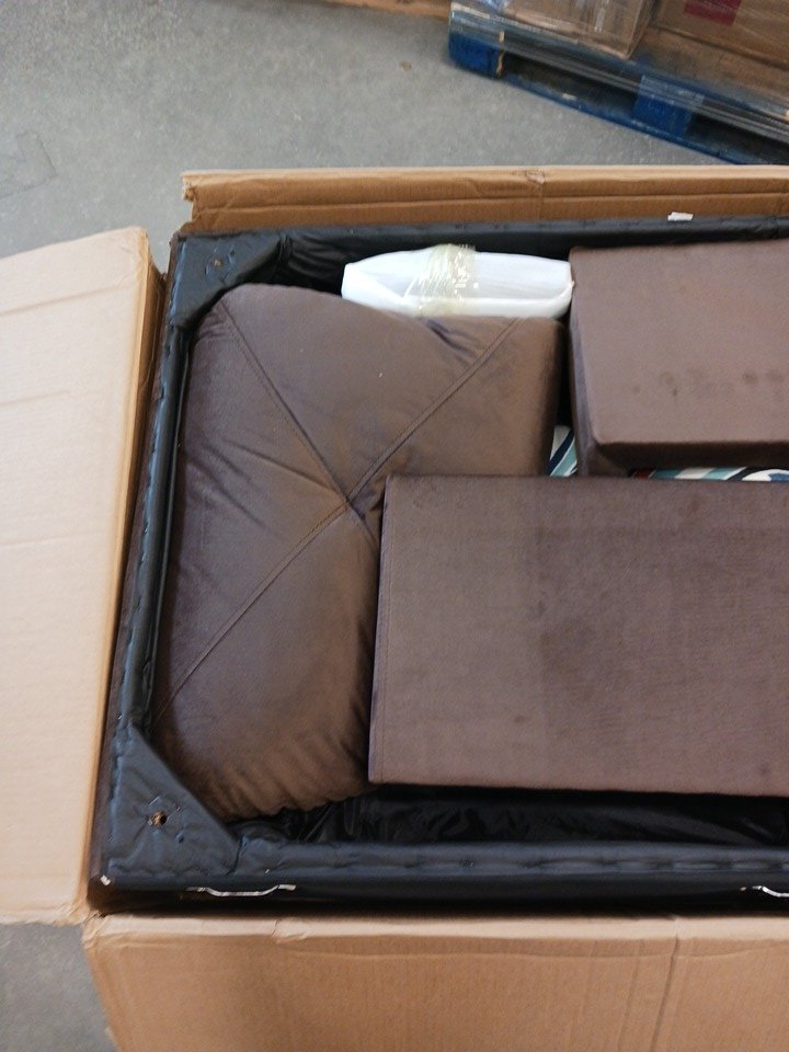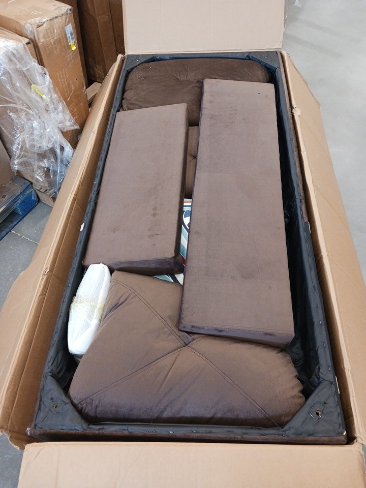 The item arrived in a distressed package, and there is a visible tear in the fabric along one edge of the sofa where the packaging was exposed. The affected area appears limited to the surface material and does not impact the structure or seating integrity of the chaise. The frame, cushions, and upholstery elsewhere remain in good condition, with no other visible damage or defects.