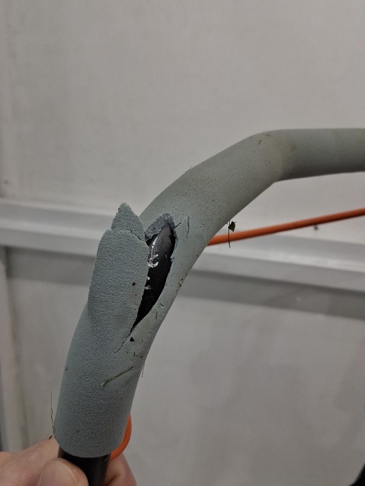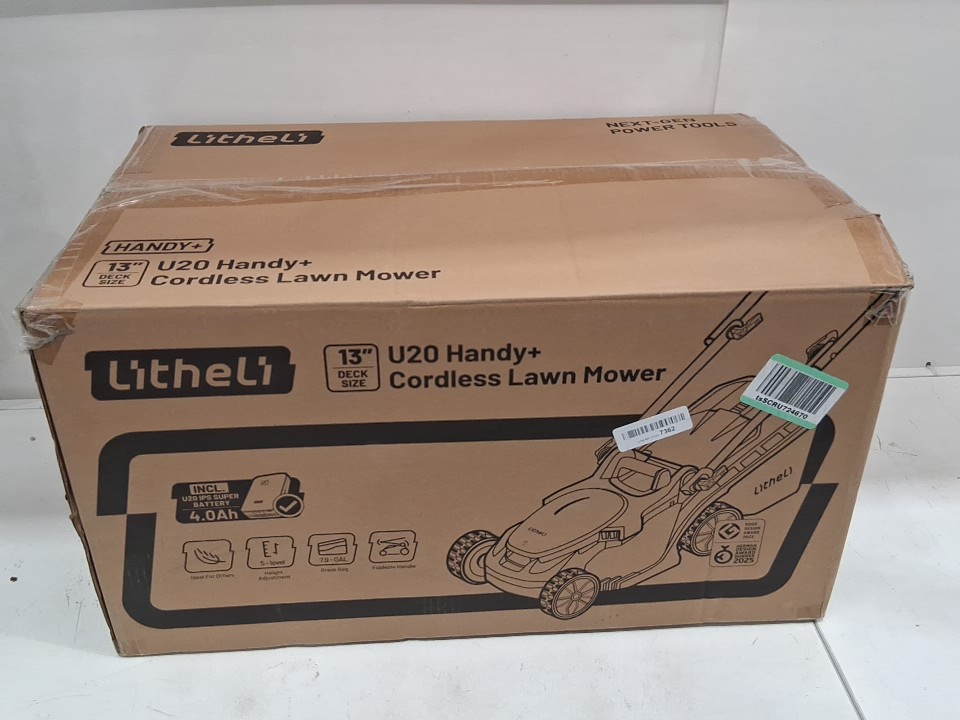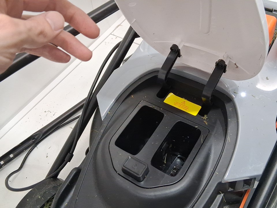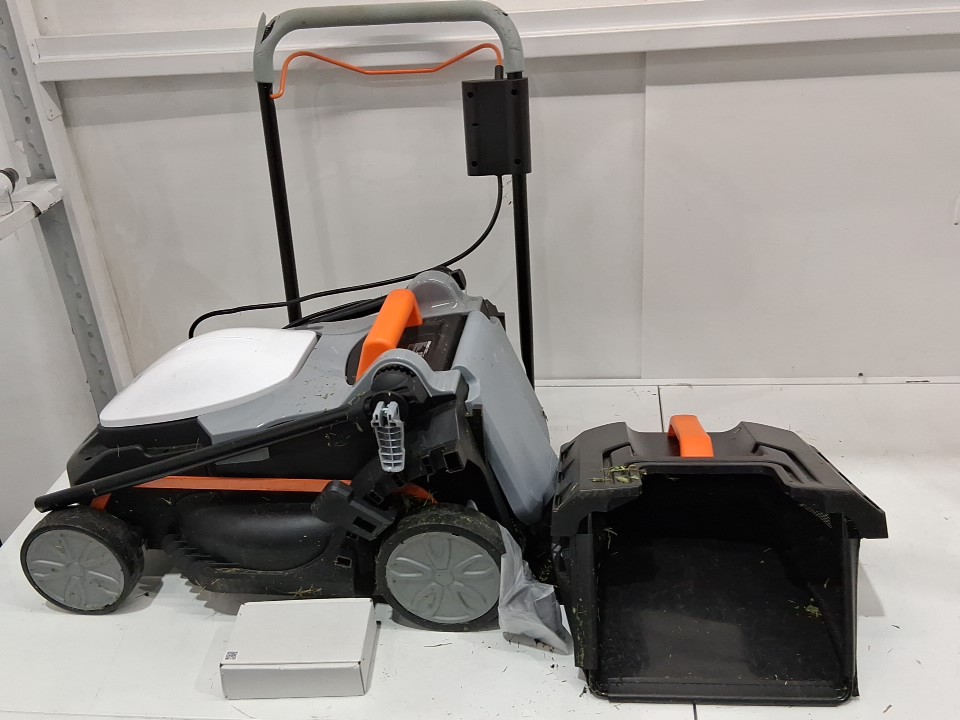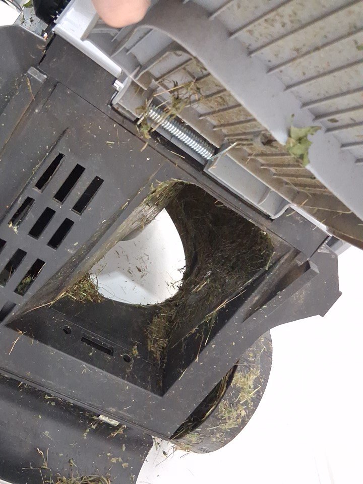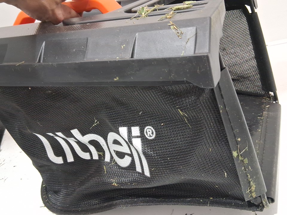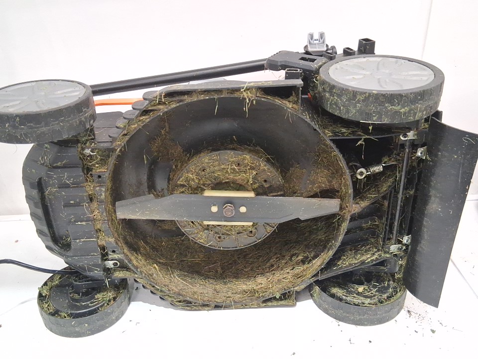 Item has significant dried grass/dirt debris stuck around the blade/interior, a small tear in the hand grip, general cosmetic wear along the exterior and in the grass bag, see photos.