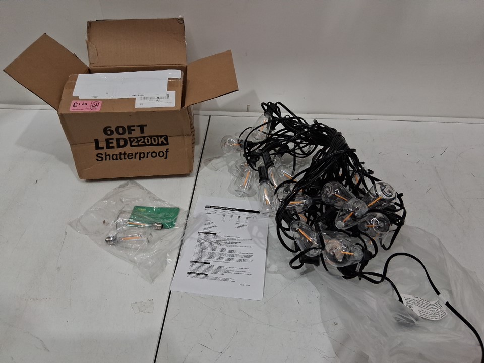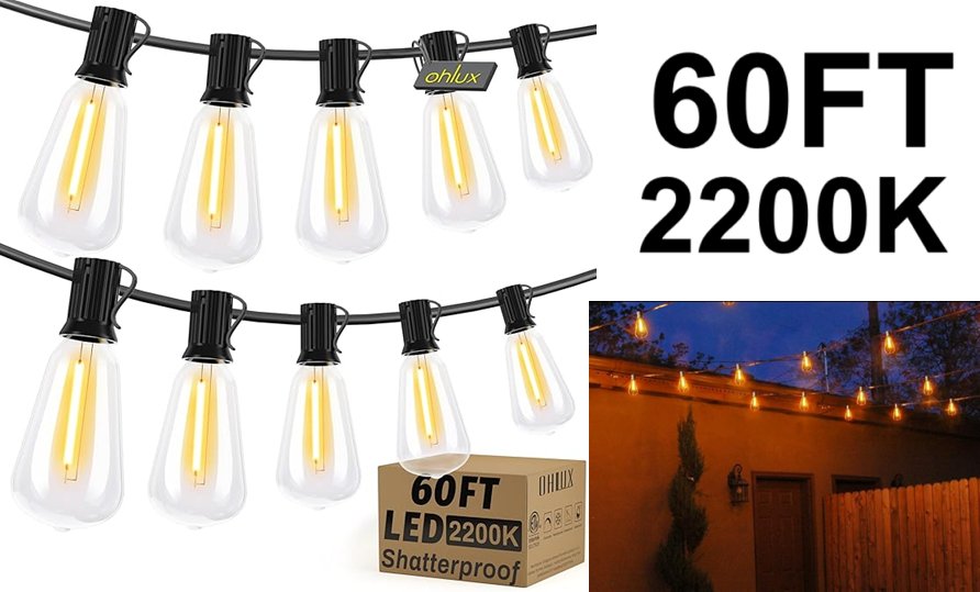 OUTDOOR SHATTERPROOF LED STRING LIGHTS WITH WINTAGE EDISON BULBS - 60FT - 2200K - WARM WHITE
