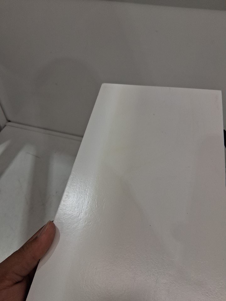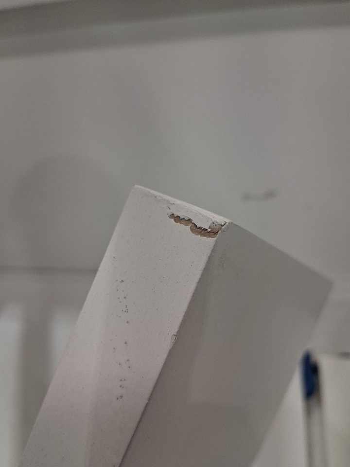 shelves have some damaged paint and dings due to shipping. some of the portion has yellow stains.