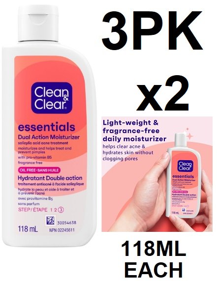 2 (3PK) CLEAN & CLEAR ESSENTIALS DUAL ACTION MOISTURIZER - FRAGRANCE FREE - 118ML EACH