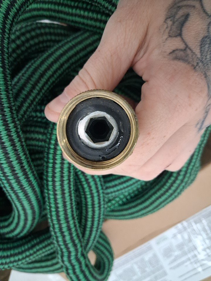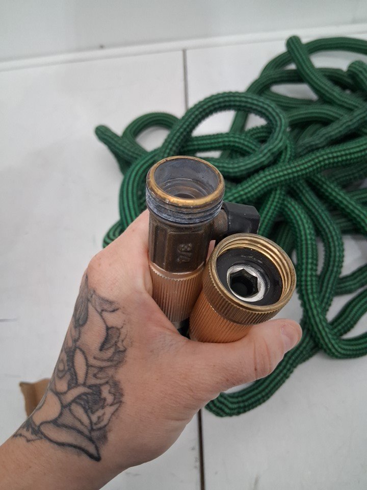 Hose was water discoloration on ends, and still has some water inside. Nozzle is missing