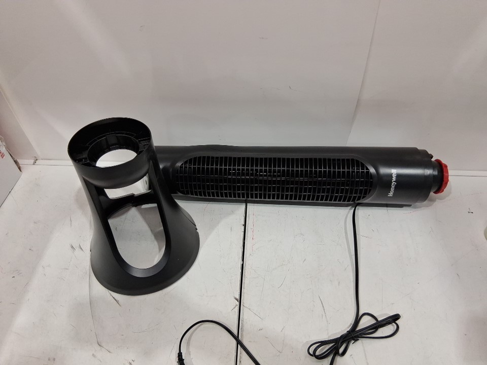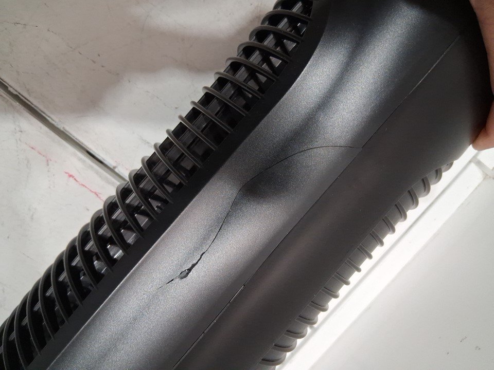 item has a crack in the base, large cracks on both right and left side and on the back of the fan, fan was tested for power and is still working
