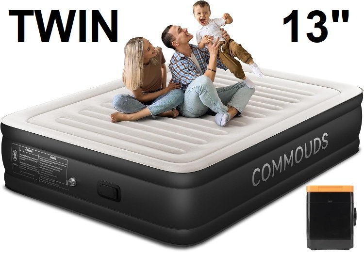 COMMOUDS Portable Blow up AIR MATTRESS WITH BUILT IN BATTERY POWERED PUMP AND CARRYING BAG - 13" TWIN- BEIGE/BLACK (model: SZ-d811)