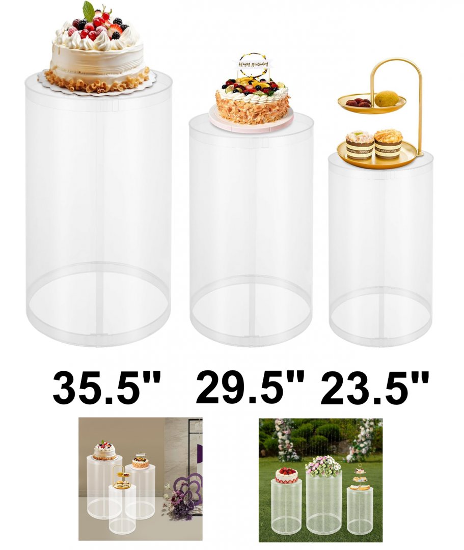 3PC clear plastic Cylinder Pedestal Stands for Weddings and celebrations - 23.5" 29.5" and 35.5" tall