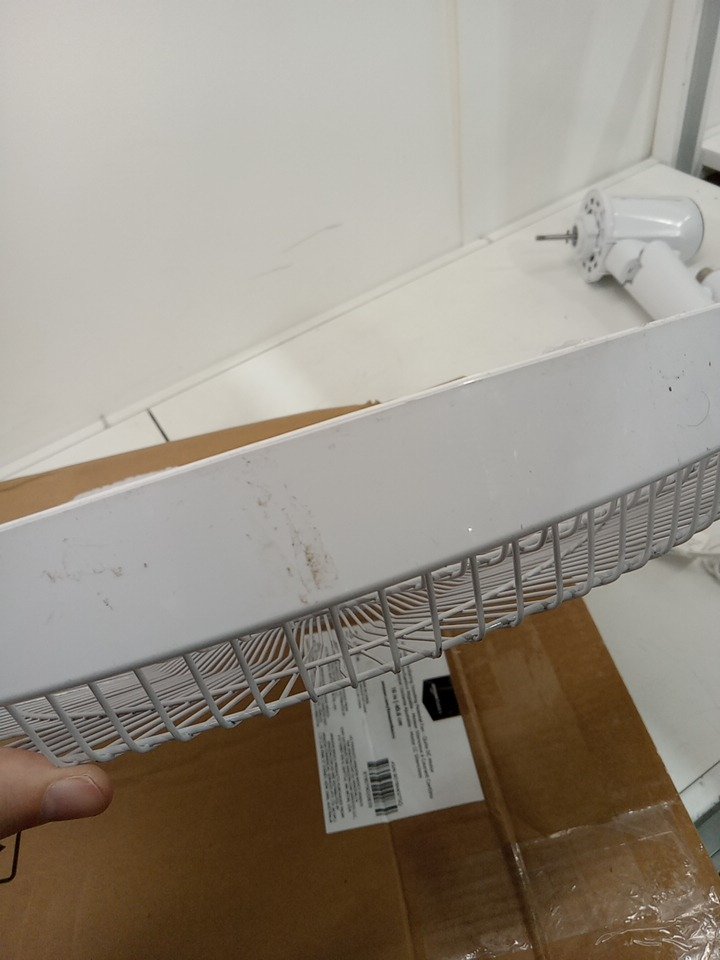 has a sticky residue on one side of the fan cage. Can likely be cleaned.