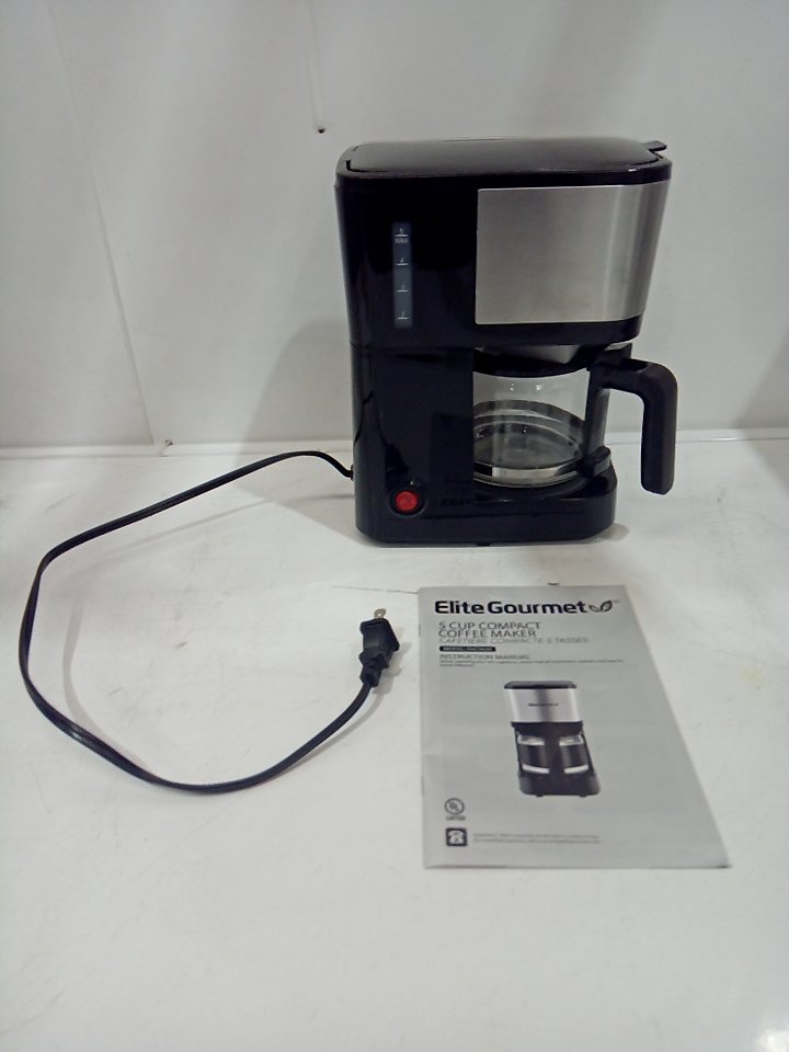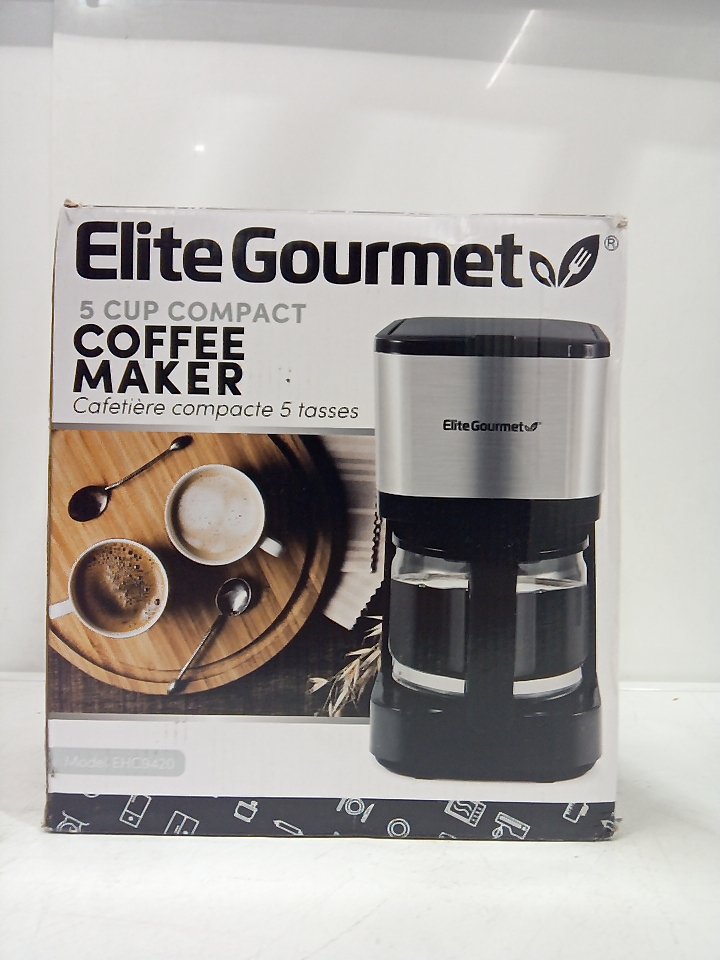ELITE GOURMET COMPACT COFFEE MAKER - 5 CUP GLASS CARAFE - BLACK/STAINLESS STEEL (MODEL: EHC9420)