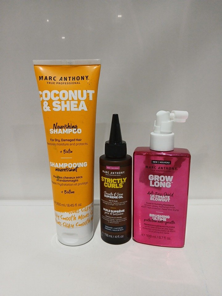 3 ASSORTED MARC ANTHONY HAIR CARE PRODUCTS - Anti-Frizz Shield Ultimate Blowout Spray / Nourishing Scalp & Hair Supreme Oil/ Coconut Oil Shampoo