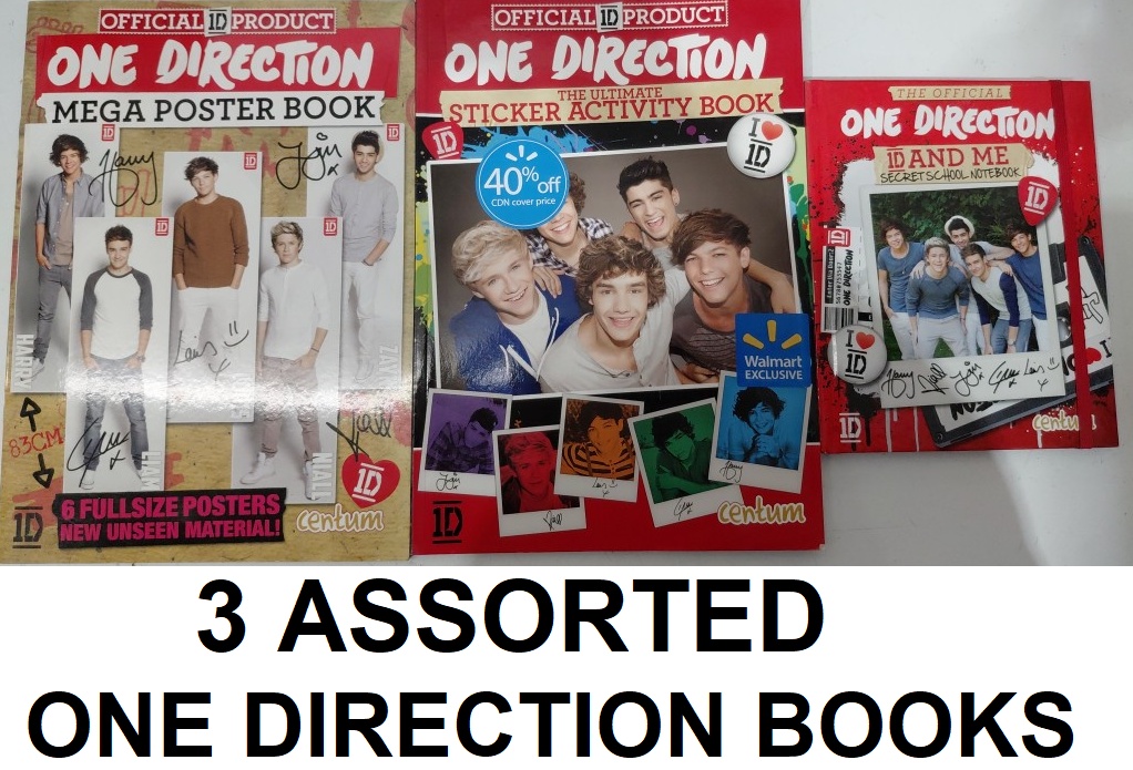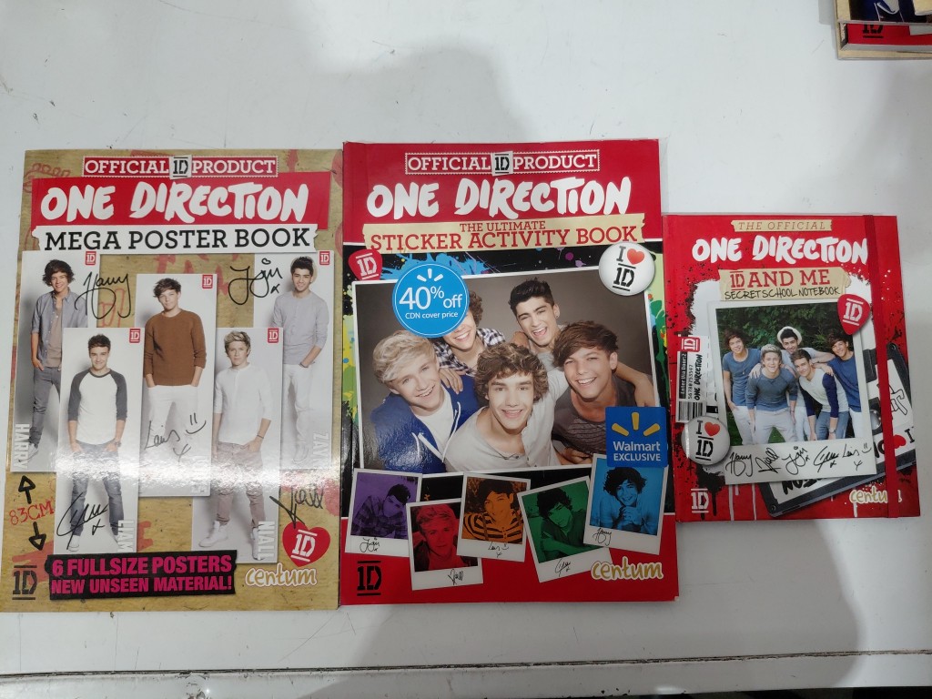 3 ASSORTED ONE DIRECTION BOOKS - 1d and me secret school notebook, the ultimate sticker & activity book & poster book