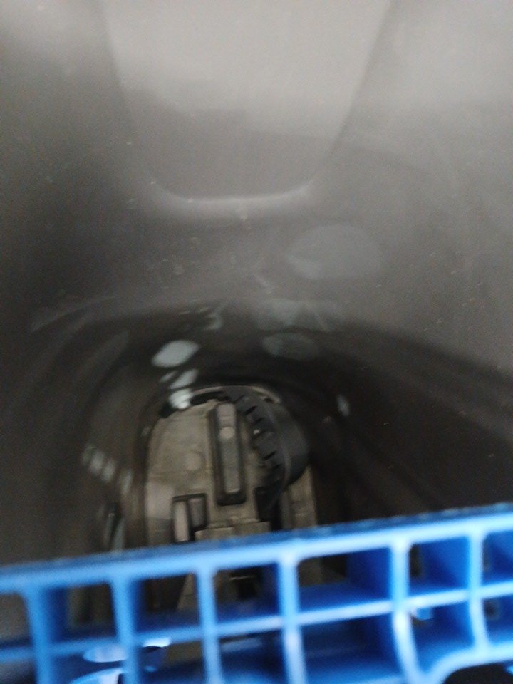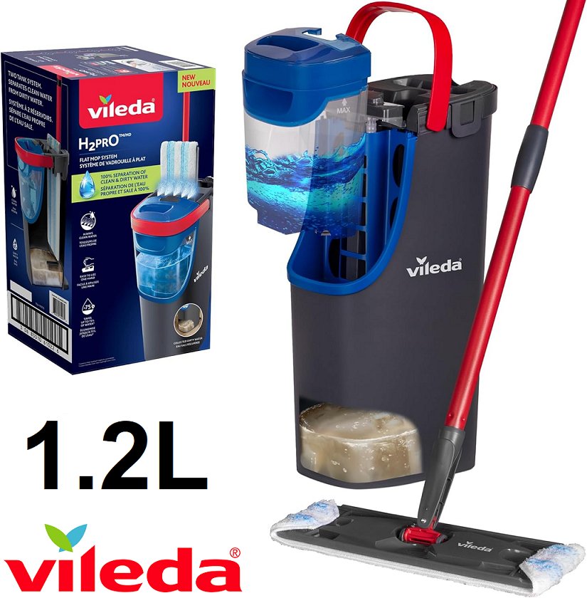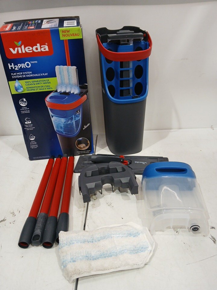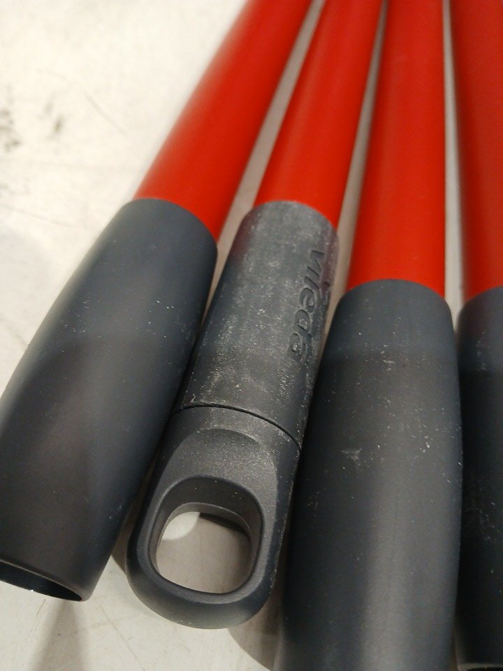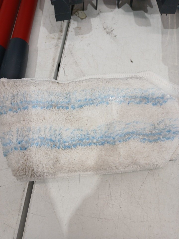 The handle of the mop is scuffed and the pad is used.