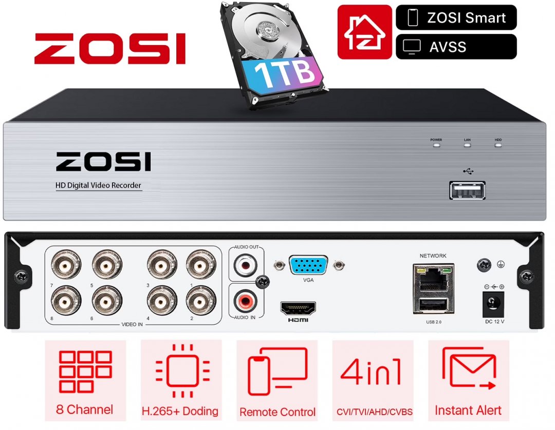 ZOSI 8-Channel 1080P 4-in-1 Surveillance DVR Video Recorder with Real-Time Recording and Playback, Smart Motion Detection, Remote Live View via Mobile App and USB Backup (Model: 1AR-08VNA10-US)