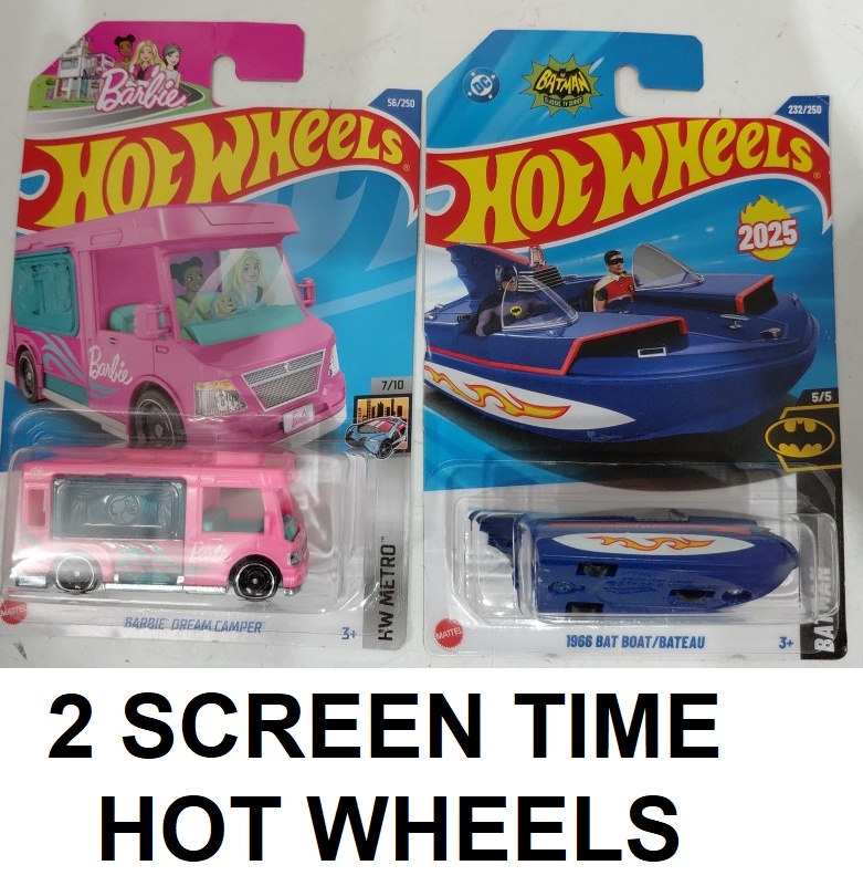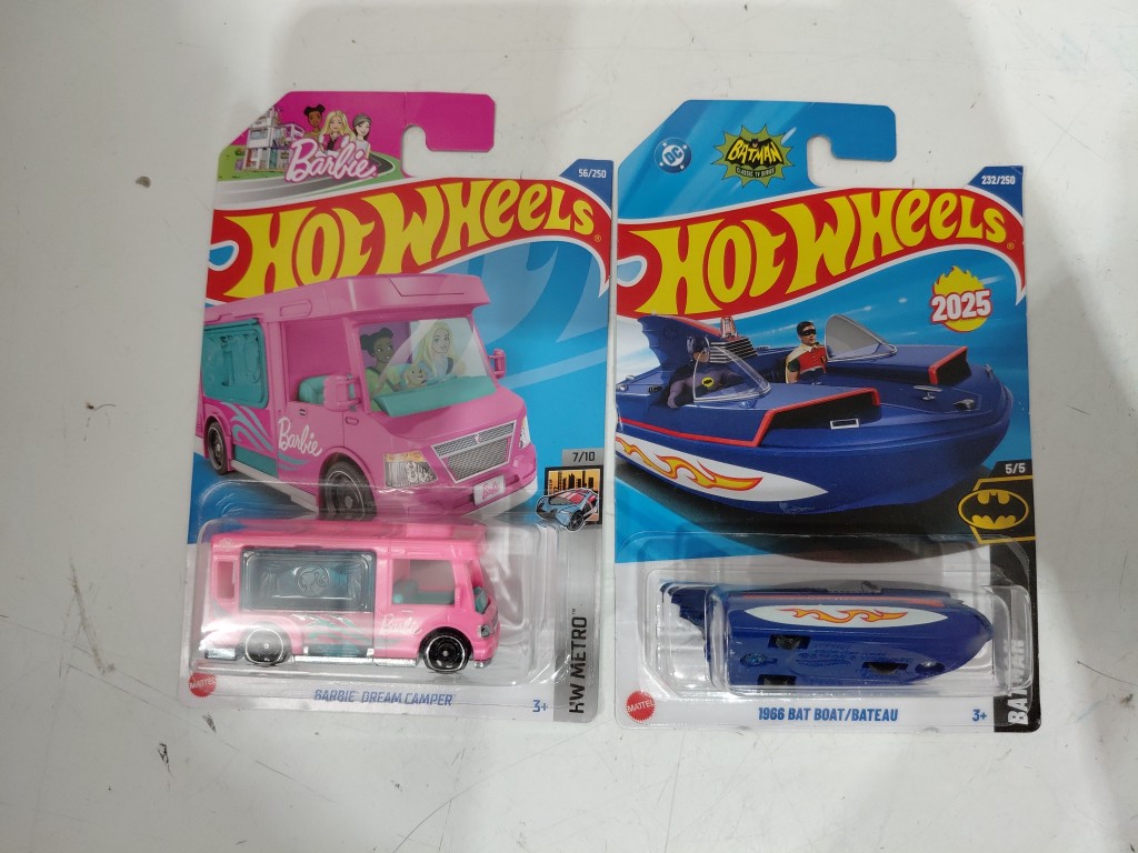 2 assorted screentime hot wheels - barbie dream camper & batman 1966 bat boat/bateu