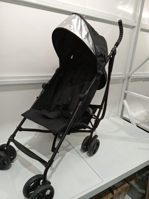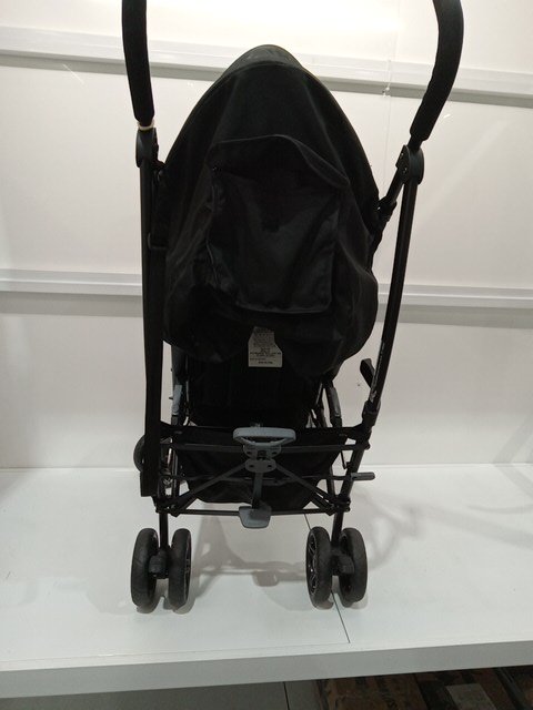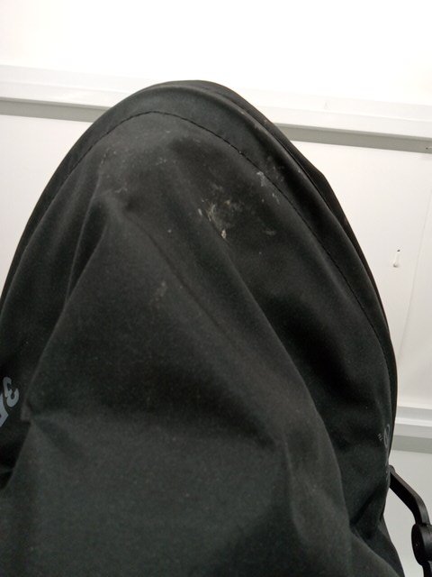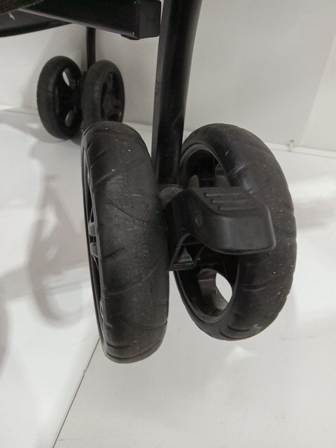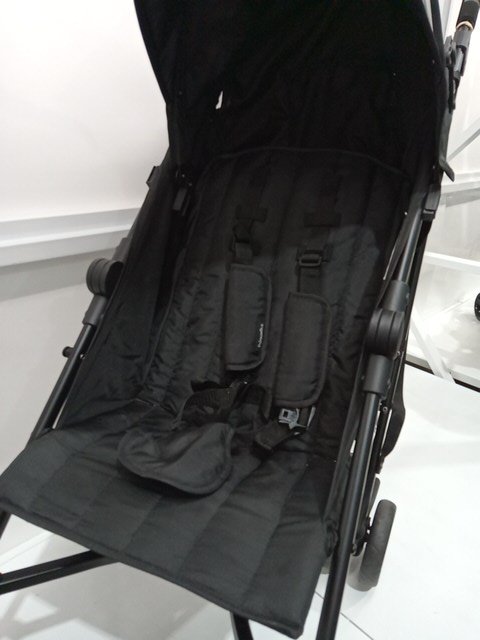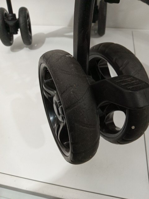 there is some signs of previous use. stroller wheel have dirt and debris present as well as some basic wear. top of the stroller has some dirt as well as inside the stroller seat.