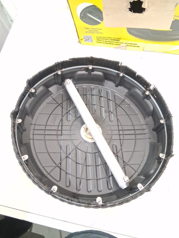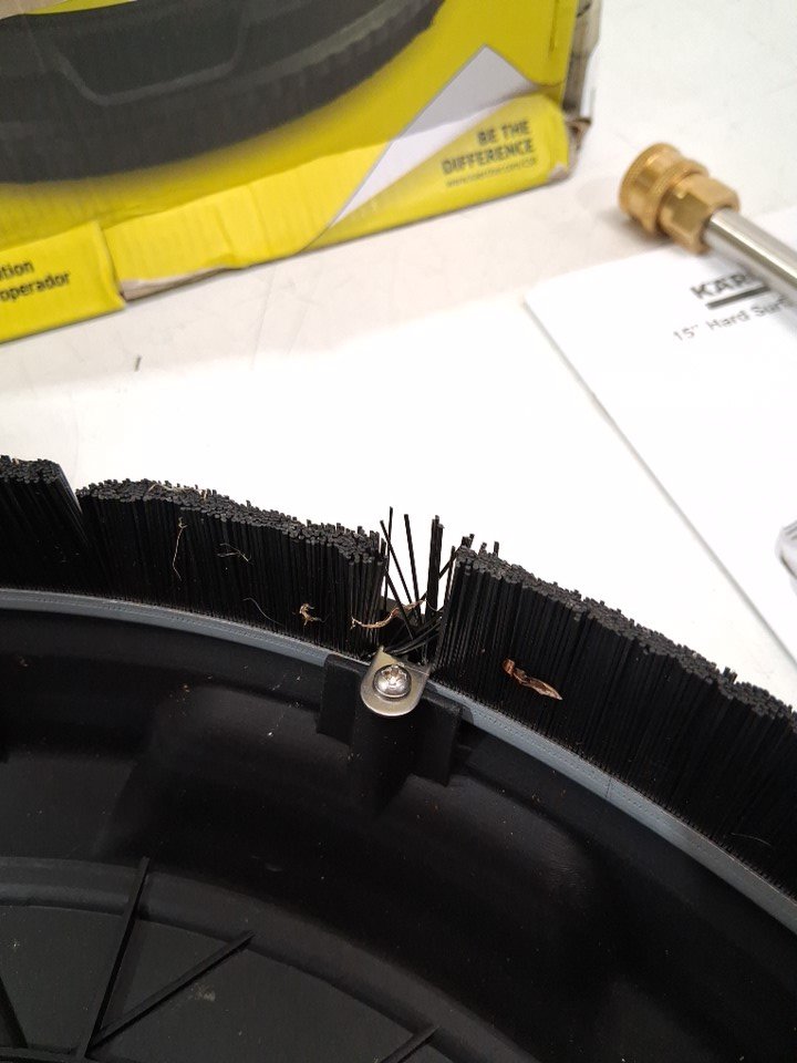 item has nature debris on it like leaves, grass and dirt from previous use and has some bent bristles - see photos