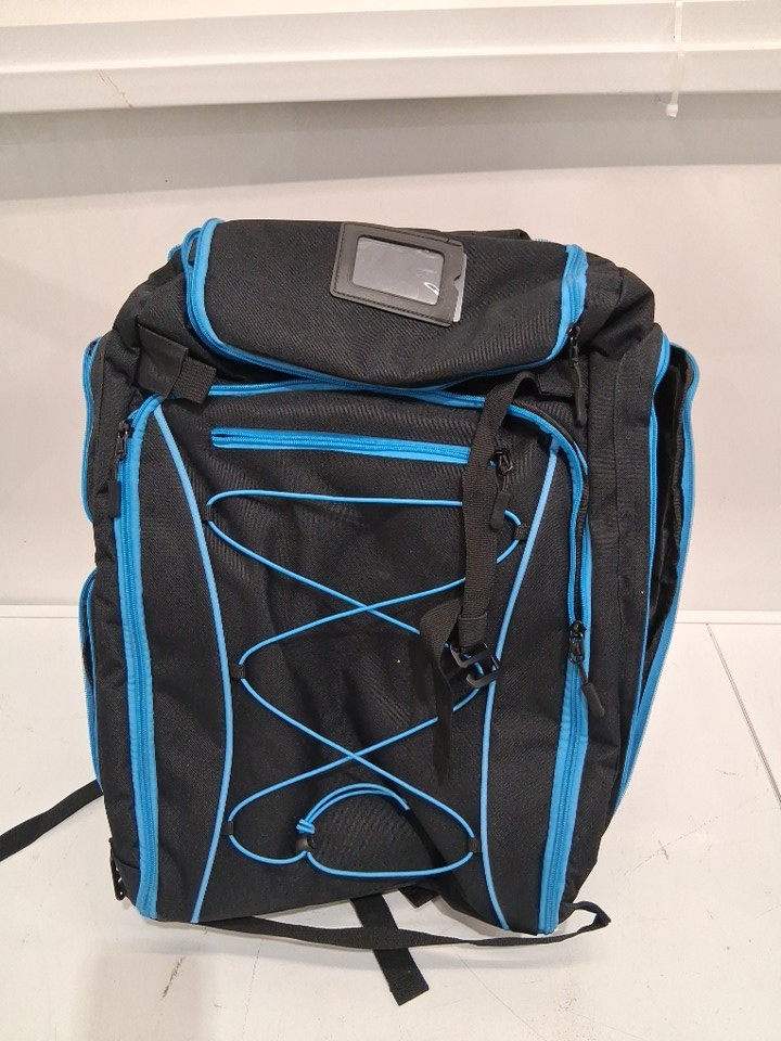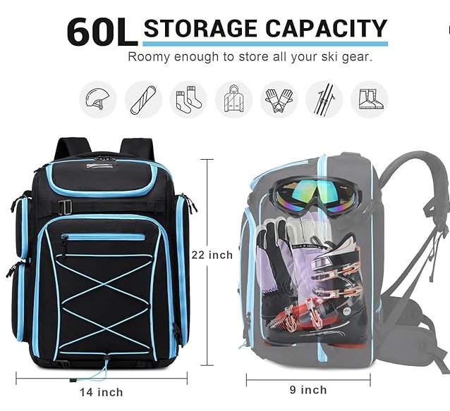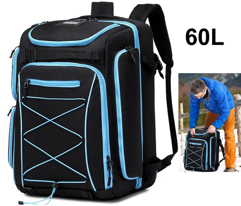 fixitok ski boot backpack- waterproof, 9 pockets travel pack -14" x 9" x 22" , 60L - black/Blue