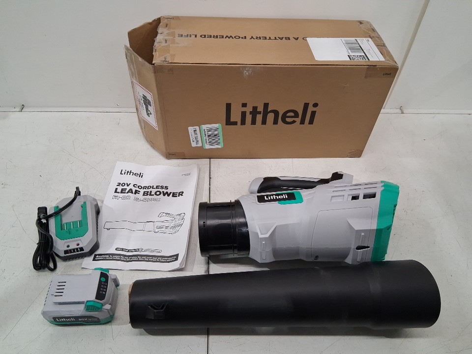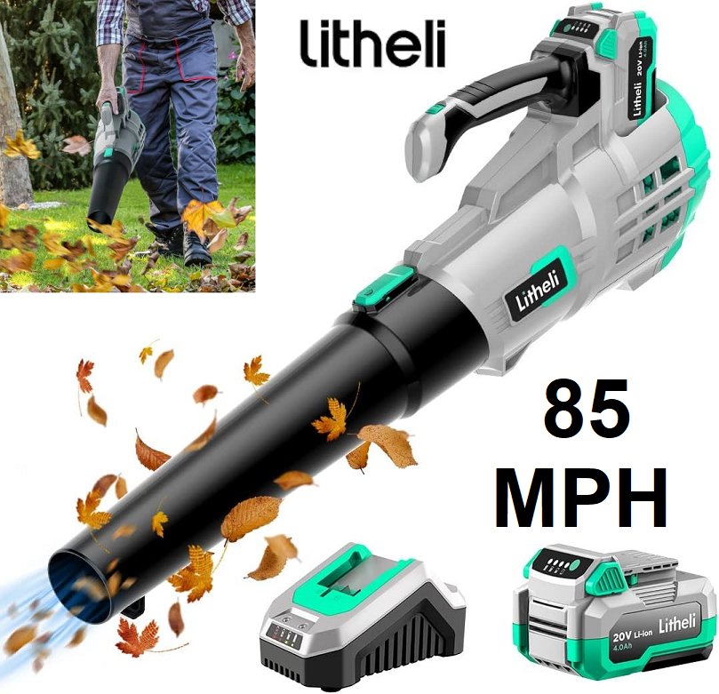 LITHELI CORDLESS ELECTRIC LEAF BLOWER WITH BATTERY & CHARGER - 20V - 85 MPH/350 CFM - green/grey (MODEL: d07102150)