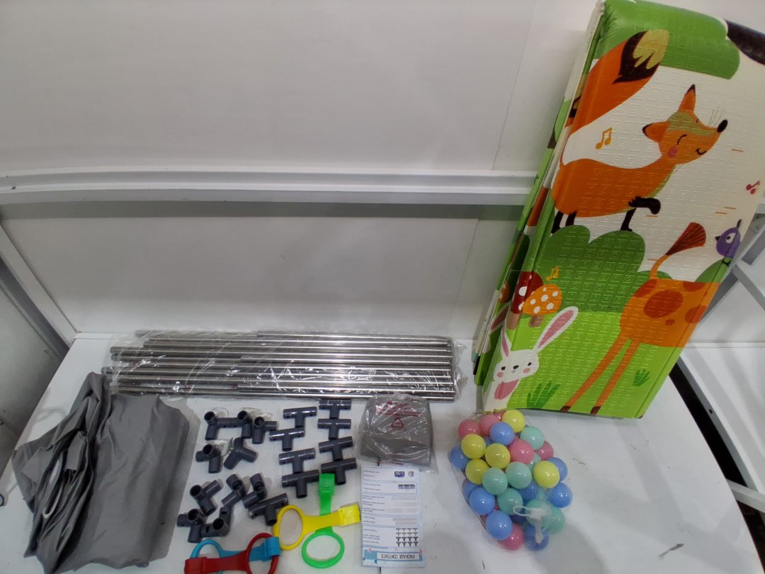 Signes of light use, some dirt on padding, minor stains on playpen liner. One T bracket is damaged but there is a spare. See photos
