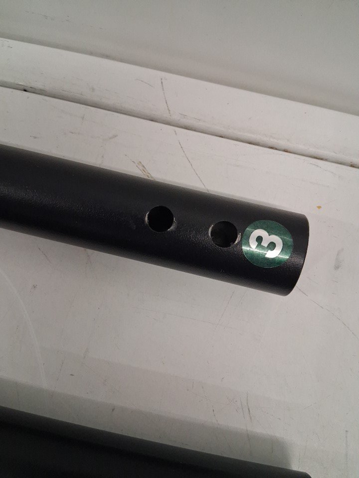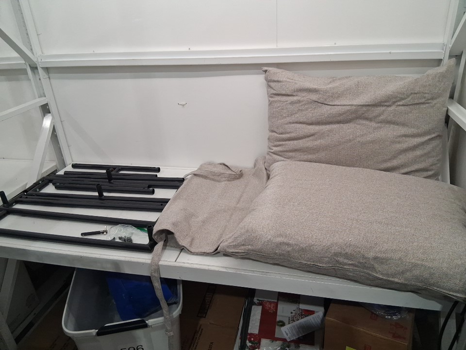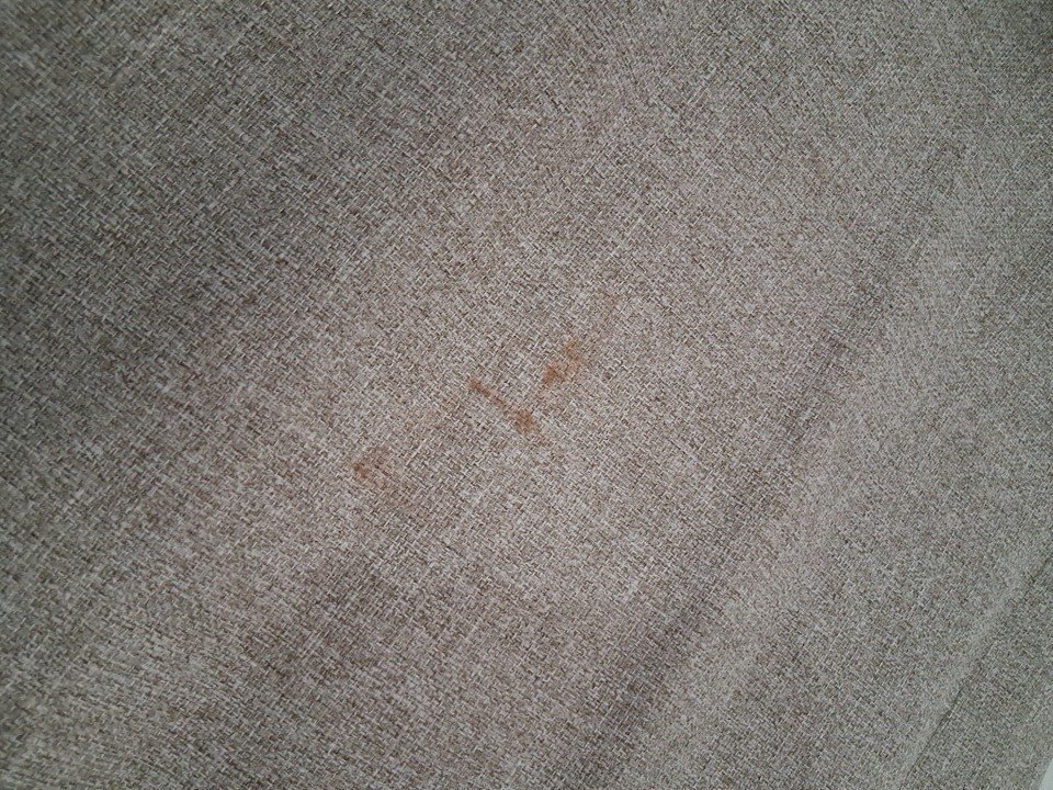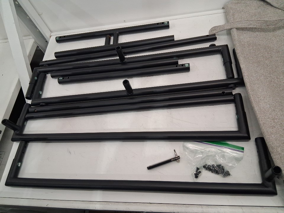 Chair has tool blemishes and light rusting on poles. Sling for chair has a brown stain on it. Hardware is in ziploc bag