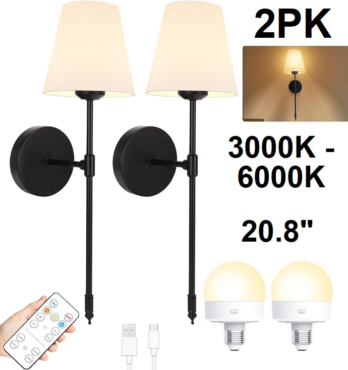 2pk Yollzey Dimmable Wireless Wall Sconces with Remote Control and rechargeable light bulbs - 3000k to 6000k - 20.8" - black/white(MODEL: bows2)