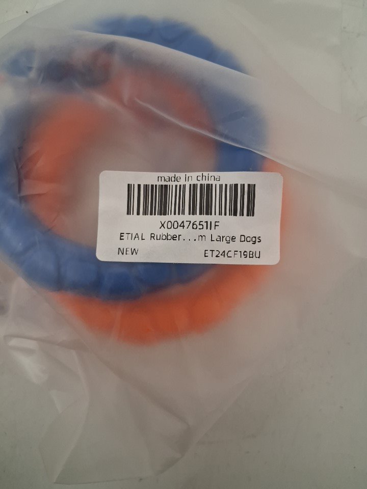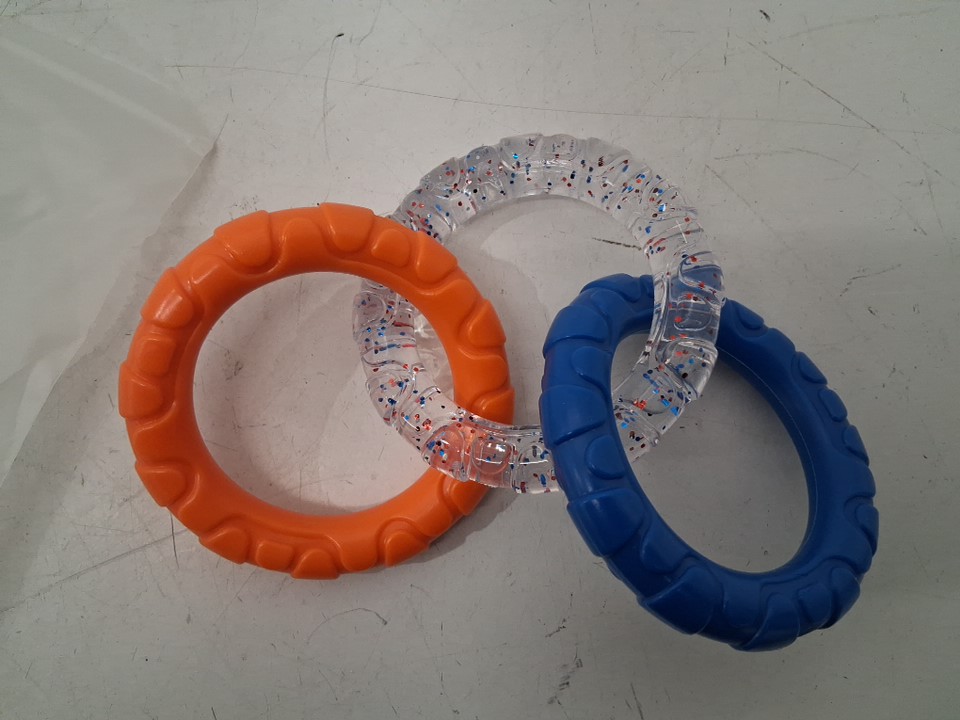 etial rubber 3-ring indestructable tug dog toy - orange/blue/white
