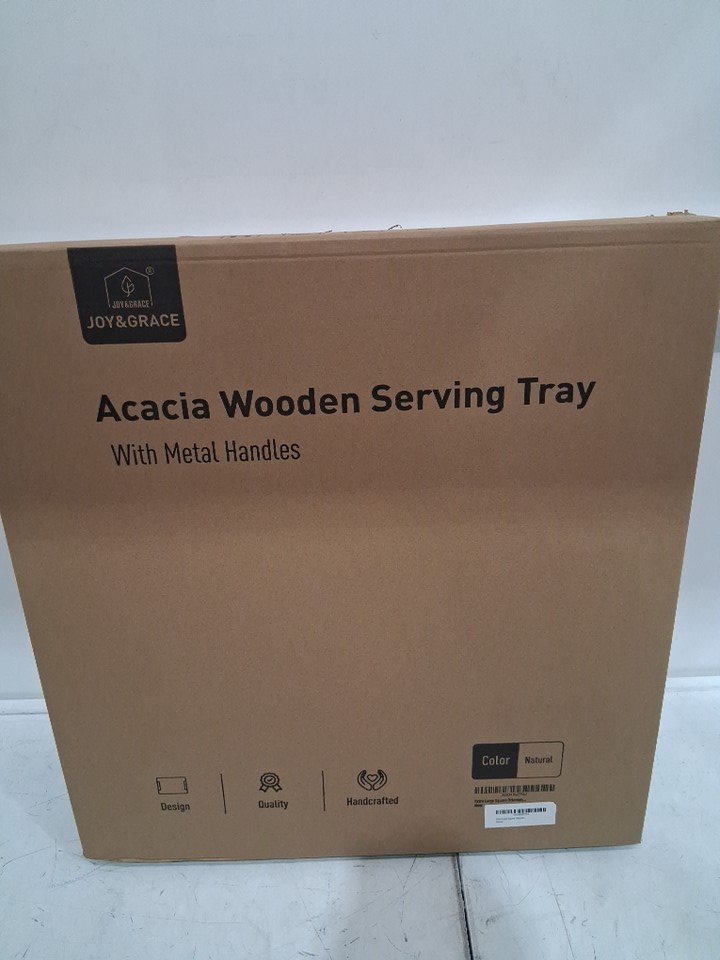 JOY&GRACE ACACIA WOODEN SERVING TRAY WITH METAL HANDLES - 17" X 12" X 2"