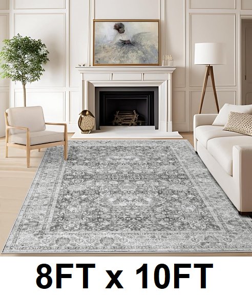Distressed Floral Boho NON SLIP AREA RUG - 8FT X 10FT - GREY