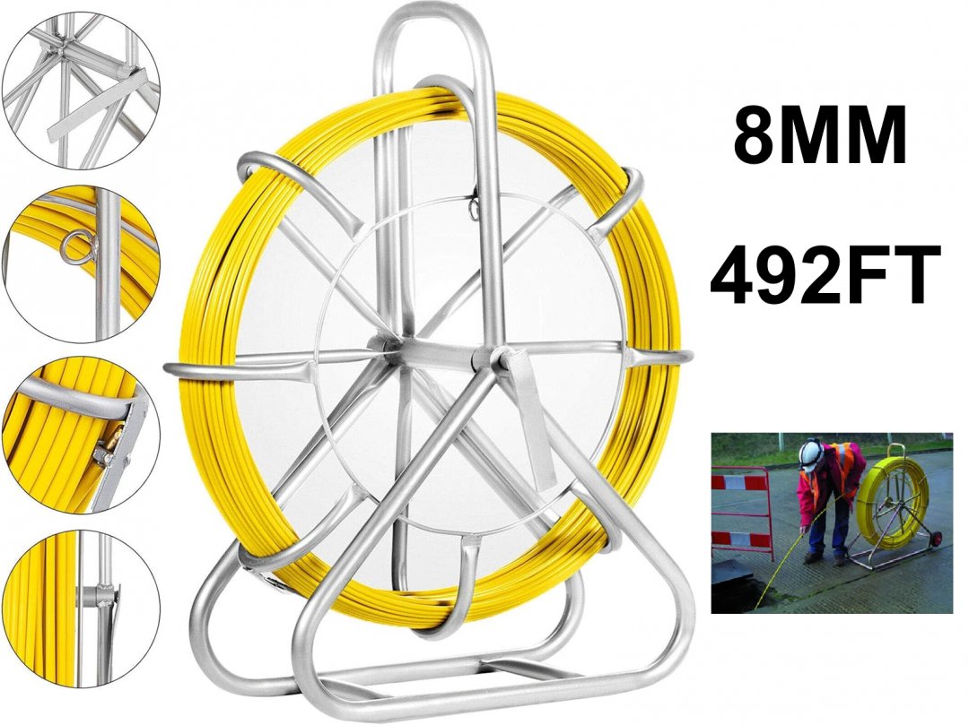 BBTEQEKN Fish Tape Fiberglass Cable Duct Rudder Steel Reel Stand with Brake - 8mm - 492FT - Yellow (MODEL: ‎BBTEQEKN-MKDF-FGFV)