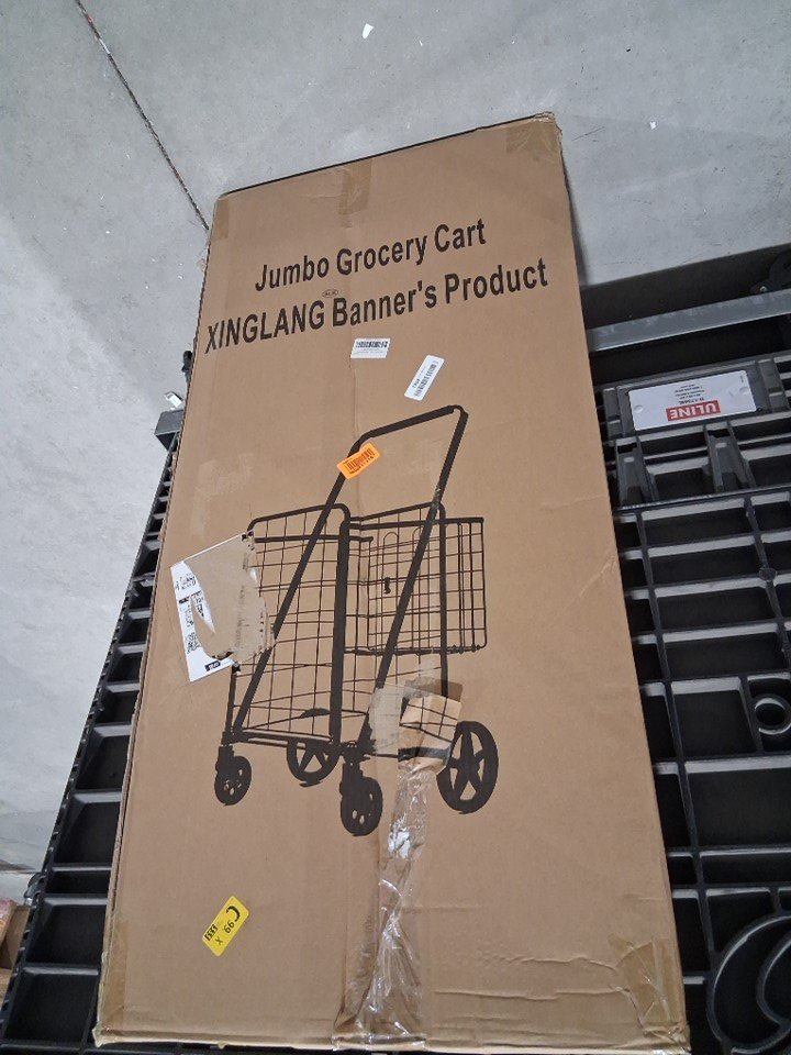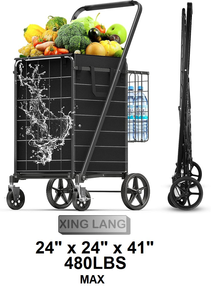 XING LANG Folding Shopping Cart with 360° Rolling Swivel Wheels & Brakes - Large Foldable Grocery Cart with Double Basket & Waterproof Liner - 24" x 24" x 41" / 480lbs max - black