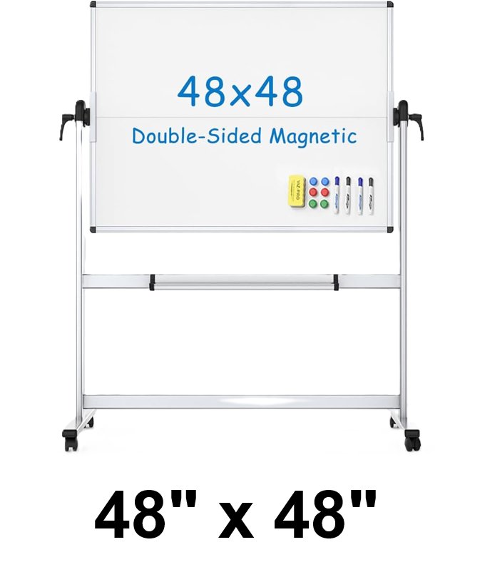 VIZ-PRO Double-Sided Mobile Whiteboard Magnetic Rolling Dry Erase Wheels with Frame and Stand - 48" x 48" (model: RFD4848H-AC)