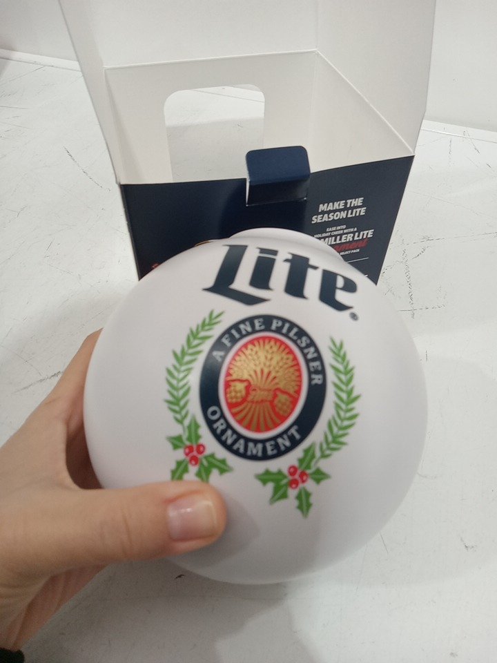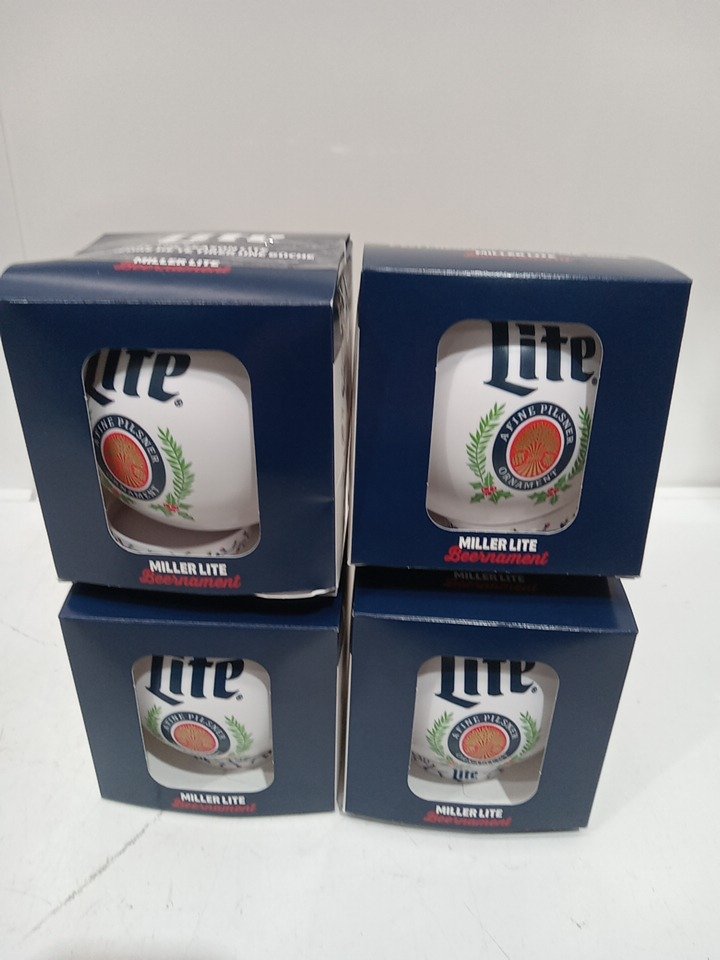 4pk MILLER LITE BEERNAMENT set - fillable beer ornament for 12 oz can - white
